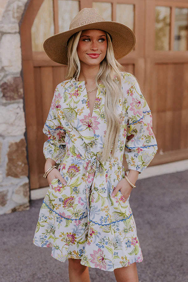 - A little charm, a lot of everyday elegance! This floral mini dress is your new go-to for making a lasting impression in the sweetest way. - Fully lined material with an abstract floral print featuring ivory, orchid, and different shades of pink, green, blue, and yellow - A v-cut neckline - Blue hued scalloped detailing - Long sleeves with elastic cuffs - Hidden side pockets - A waistline with an elastic back and a functional drawstring - A flattering silhouette that ends in a mini dress length hemline
