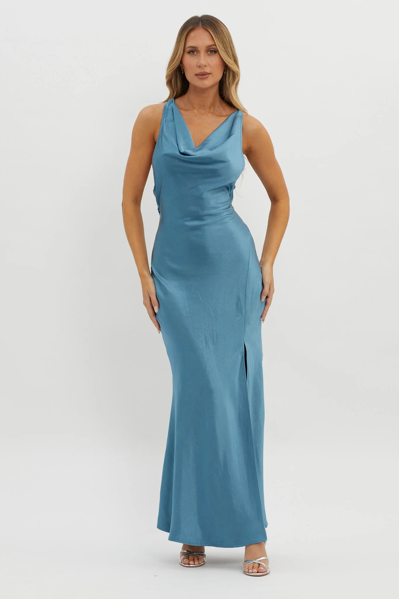 Make your grand entrance in our gorgeous Gwendelynn dress. Featuring floral applique detail in the back straps and a cowl neck. It's perfect for prom or a special event. Team it with nude heels and a satin clutch for a look we are head over heels for.