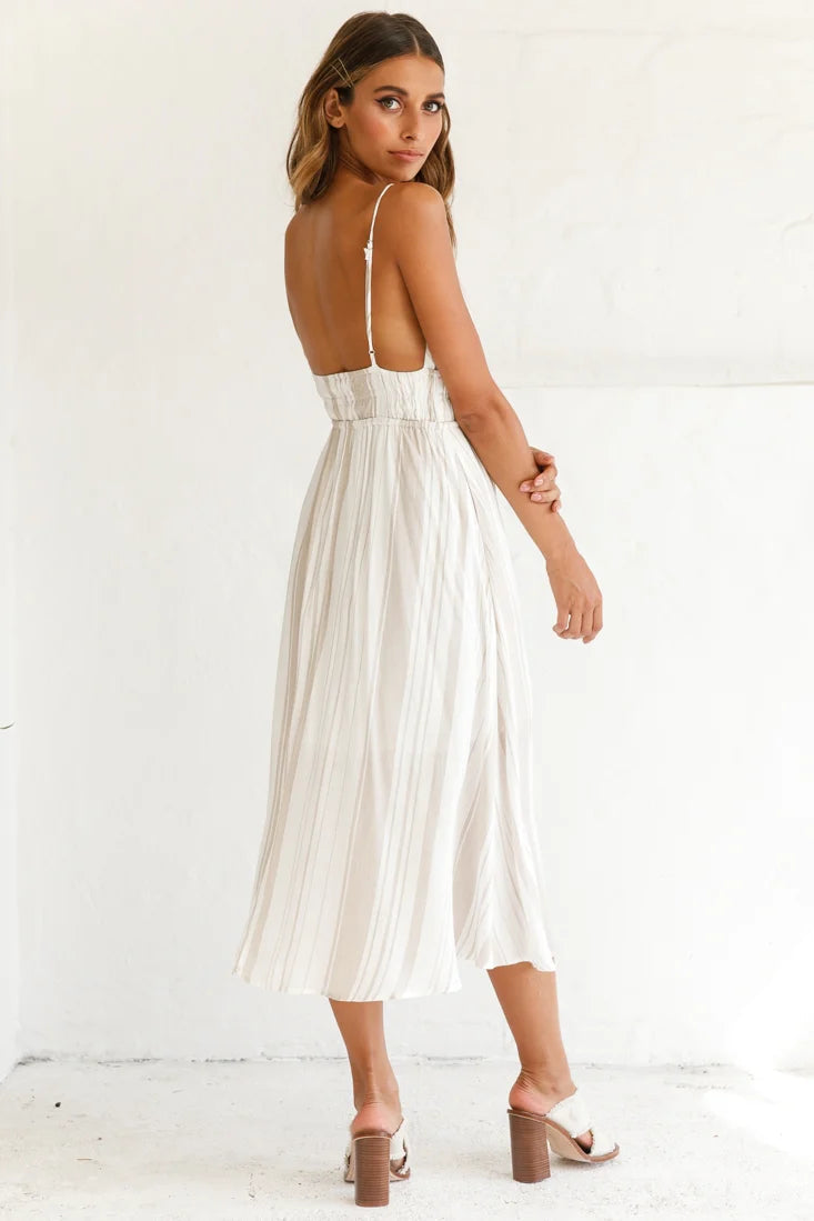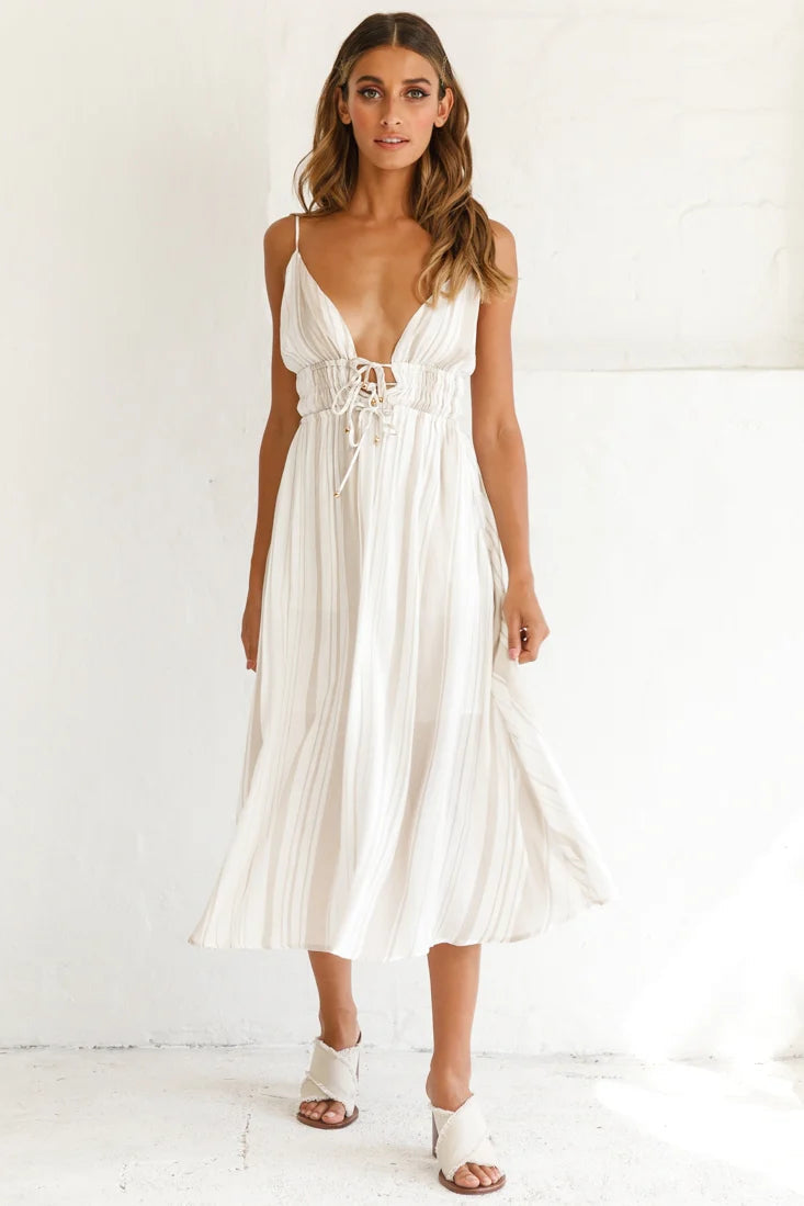 Turn heads in our breezy Hosanna dress. Partially lined to the knees it features a triple drawstring under the bust, adjustable shoulder straps, pockets and on-trend midi length. Perfect for a day by the beach or strolling the vintage flea markets. Team it with some straw wedges and a tote for a chic Summer look we are loving.