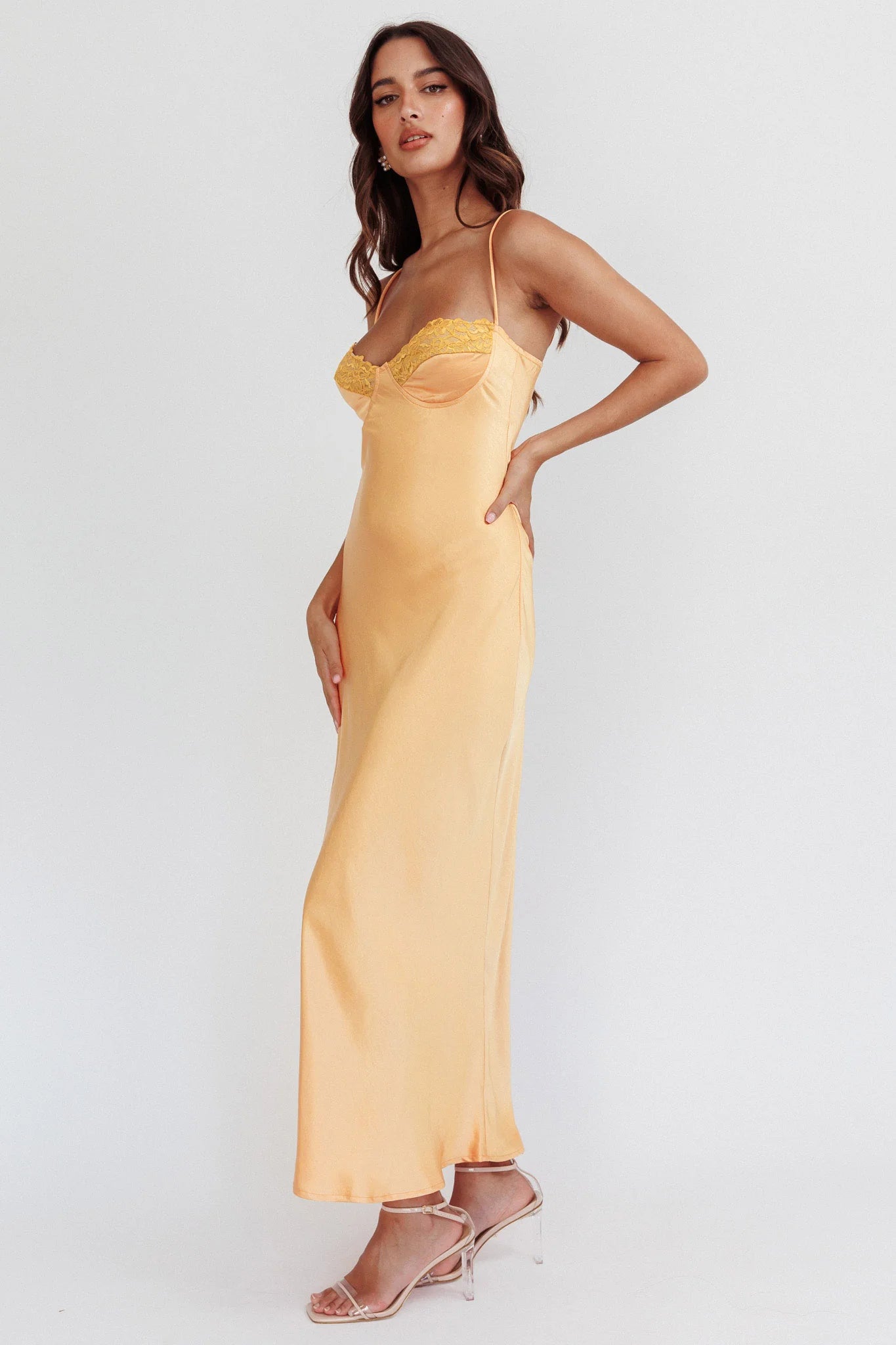 Make an entrance in our stunning Inhibitions midi dress. It features a lace-trimmed bust and pretty, satin fabric. It's perfect for a wedding or special occasion. Team it with nude heels and a clutch for a gorgeous look.