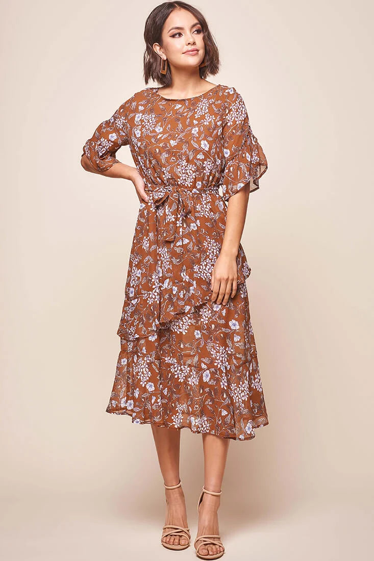 Feminine and romantic, this gorgeous, floral print midi-length dress is perfect for a day of musing around your favorite art gallery or a classy dinner with friends. Featuring fluttery ruffle-trimmed sleeves and hem, a belted waist tie and pretty diagonal ruffle across the skirt to amp up the romance factor. Team it with a nude stiletto for a look we are loving.