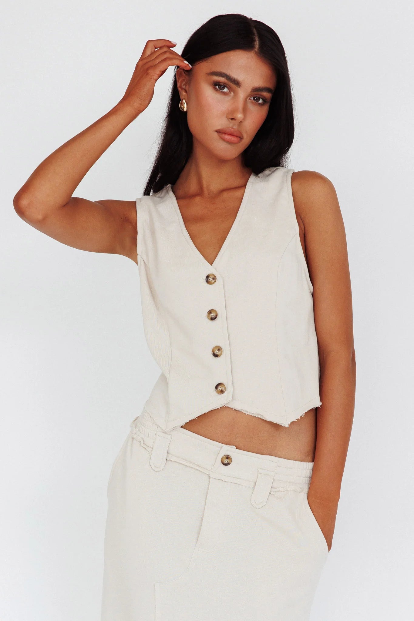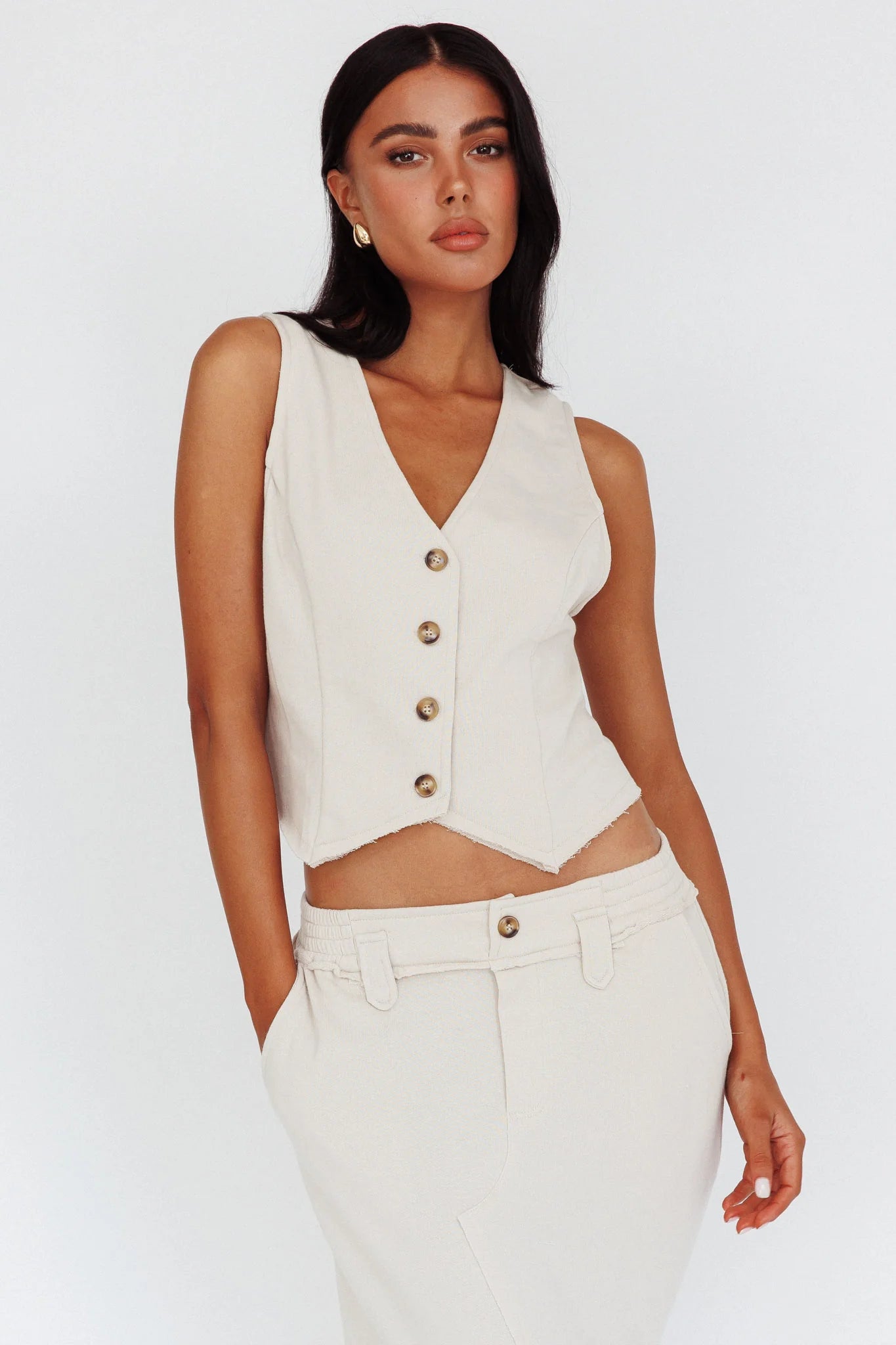 Play it cool in our super cute Jaina top. Featuring a vest style and a buttoned front, it's perfect for weekends strolling the markets or coffee dates with your girls. Team it with the Long Awaited skirt and mules for an on-trend look we are loving.