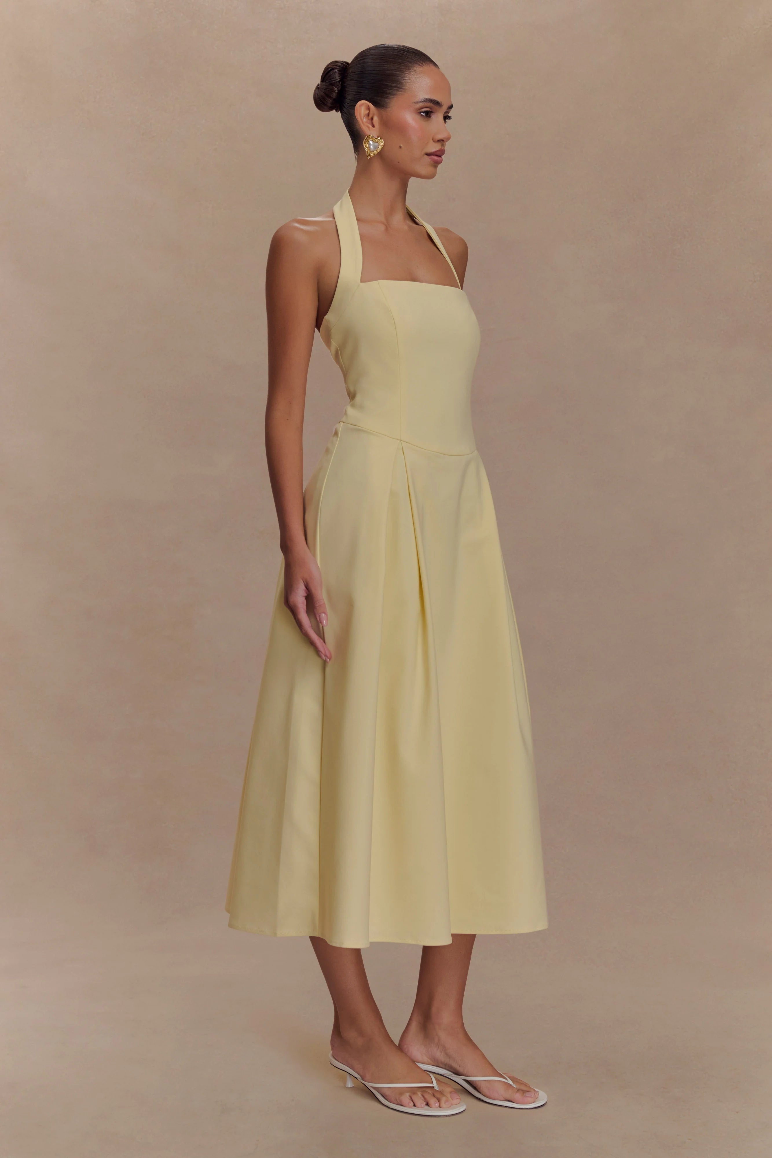 Step into timeless sophistication with the JUANA Halter Midi Dress, a graceful design that exudes femininity. Featuring a flattering halter neckline and a rounded waistline, this dress beautifully highlights your silhouette. The front and back skirt pleats add movement and texture, enhancing its refined charm. Designed in a chic midi length with a discreet side zip for easy wear, this dress is perfect for weddings, soirées, or any occasion where effortless elegance is key.