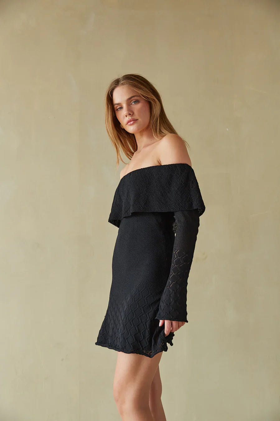 The dress of the season: The Julia Foldover Ruffle Sweater Mini Dress. This sweater dress features a ruffle foldover neckline, dainty crochet knit fabrication, and festive long sleeves. Available in Black; style with a pair of to glam this knit dress up!