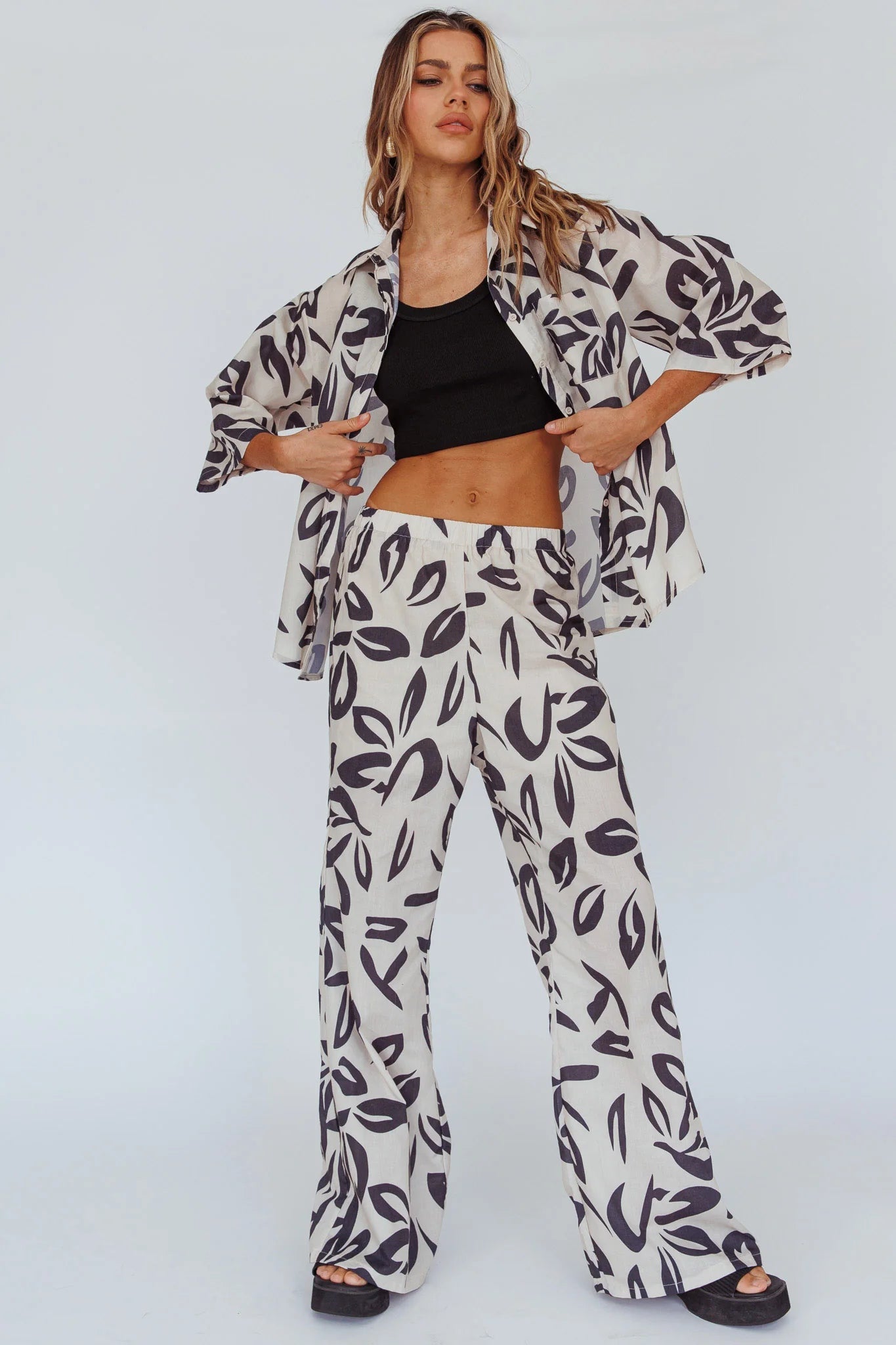 Hey there, cutie! We are loving the print on our Just A Hunch pants. Perfect for weekend brunch dates with your besties, they look super cute paired with their matching shirt or wear it with a vest and mules for a look we are loving.