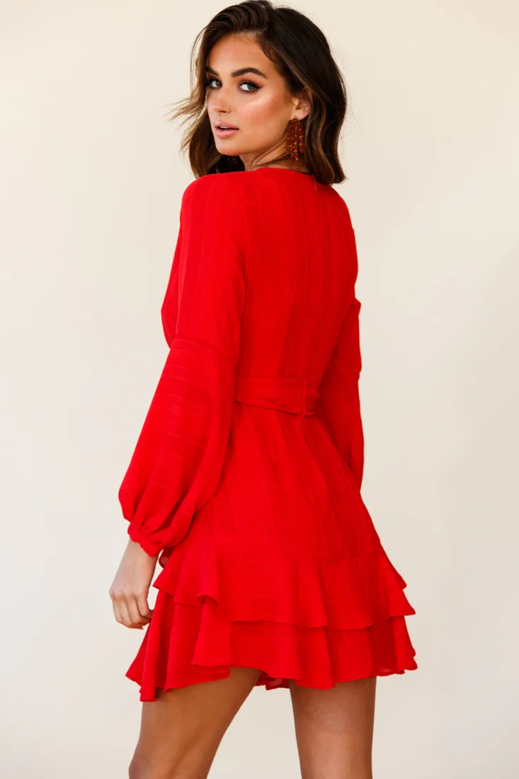 Cocktail party? Special event? This gorgeous dress has you covered. Partially lined, with its on-trend ruffle detail in the skirt, long balloon sleeves and flattering, faux-wrap neckline, you'll be turning heads every where you go. Pair it with statement heels for a look we are loving.