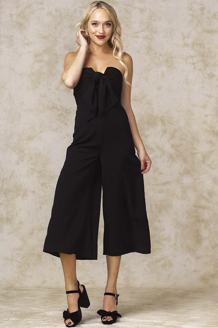 Dainty jumpsuit with some edge! This strapless number with bow tie along the bust. Wide leg trousers bring an added "je ne sais quoi"