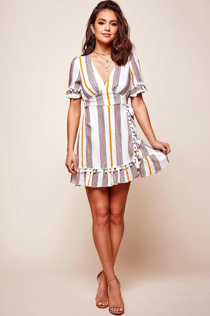 Turn heads wherever you go in this classy striped dress featuring a pom-pom and ruffle trim around the hem and sleeves. Perfect for lunch with your best gal pals or that first time meeting the in-laws! Team it with your favorite wedges or pointed-toe flats and leave everyone thinking you are one classy lady!