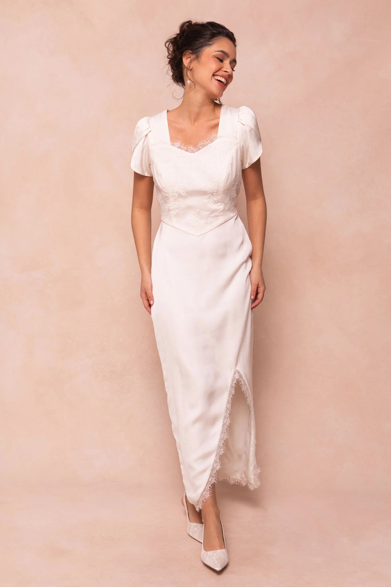 Radiate elegance with our satin Lacie Dress in White! The Lacie dress features a romantic sweetheart neckline and charming tulip sleeves. The ankle-length skirt, complete with a subtle side slit and back zipper, adds a touch of sophistication to every graceful step. This timeless design is perfect for any special occasion, exuding both style and charm!