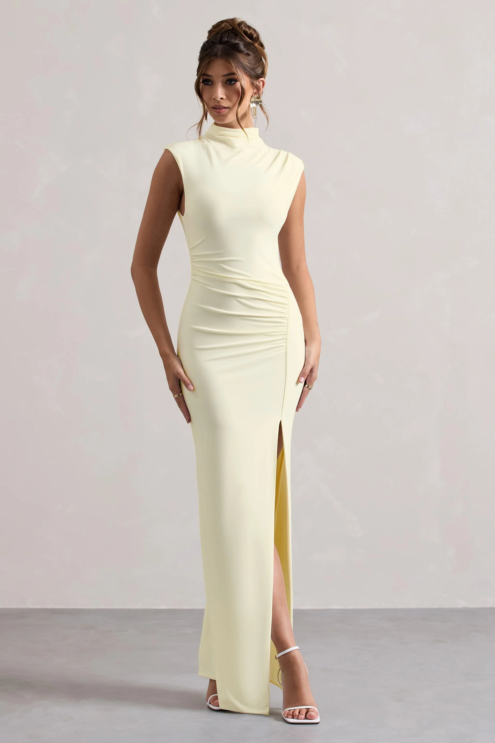 As flattering as it is flawless, captivate from all angles in Lanetta. Crafted in a fresh cream shade of our premium jersey known for its stretch properties, this curve-enhancer boasts flattering ruching to cinch your natural silhouette. Further enhancing its charm is a delicately tucked high neckline and sultry leg split thats ensured to turn heads at your next event.