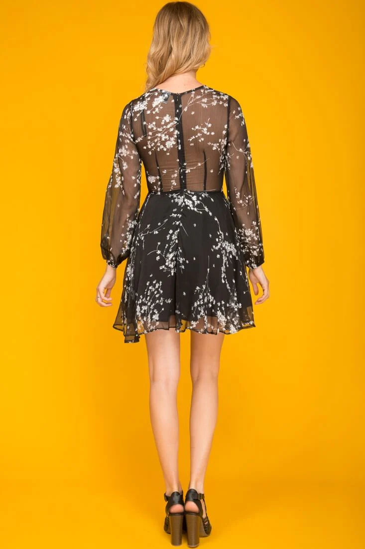White jasmine flowers dance on this tasteful, yet sheer overlay dress. Pair this with black high heels and a gorgeous charm bracelet.