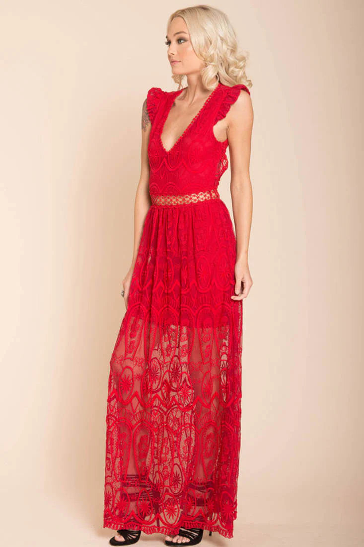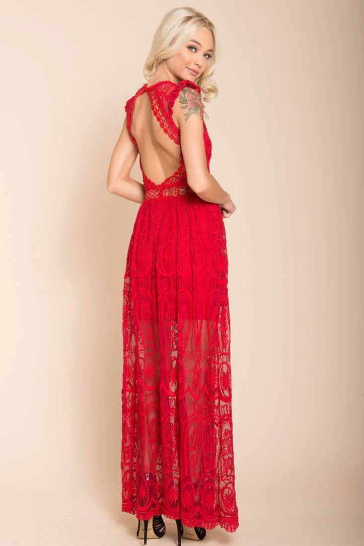 Bohemian Glamour. Capture the essence of the roaring 20s with this lacy, maxi dress with high slits and gorgeous open back.