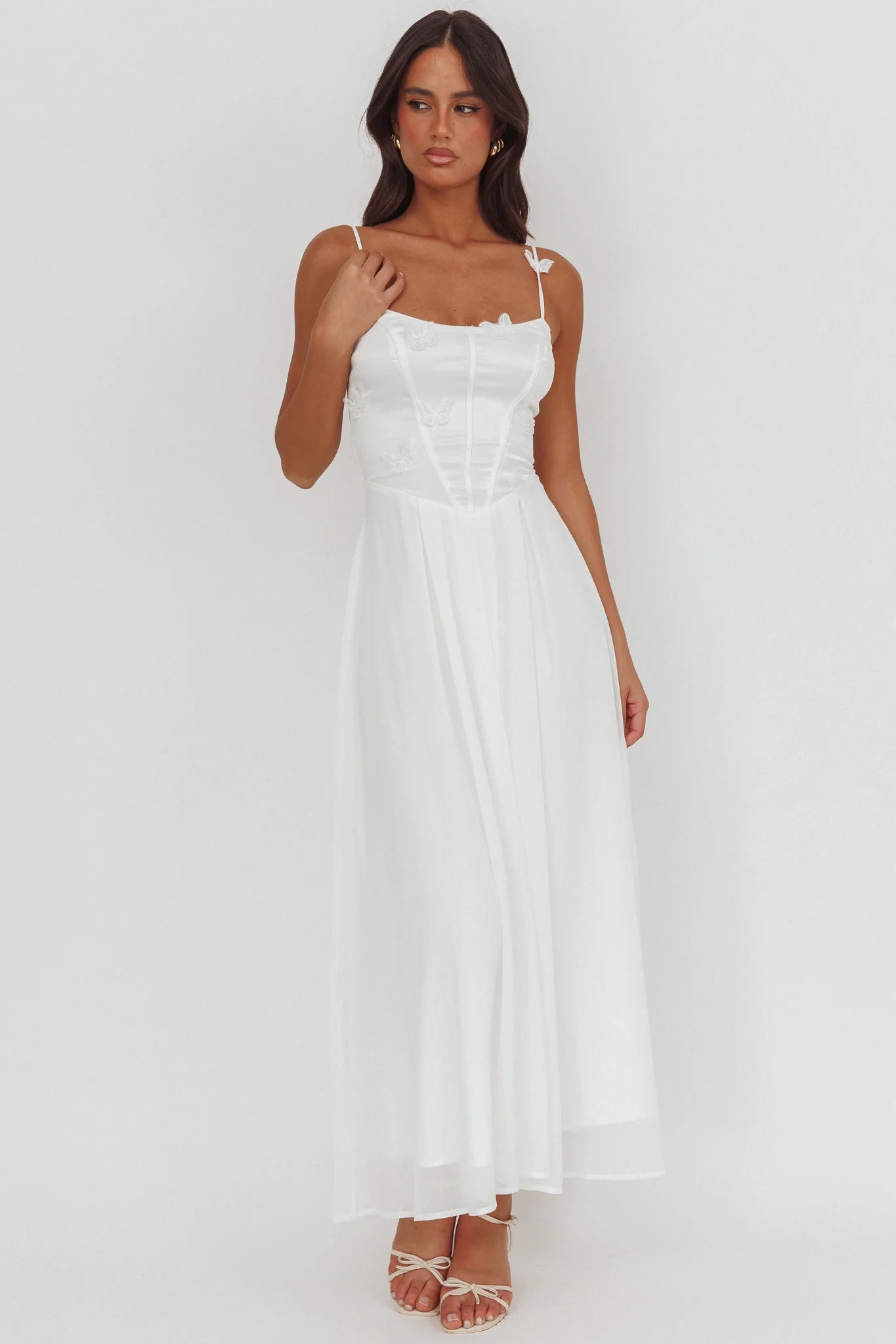 Steal the spotlight in our gorgeous Lora maxi dress. We are in love with its adorable butterfly embellishment in the bodice! Wear it to a birthday soiree or special event teamed with white, strappy heels and a clutch for a look that's fit for a princess.