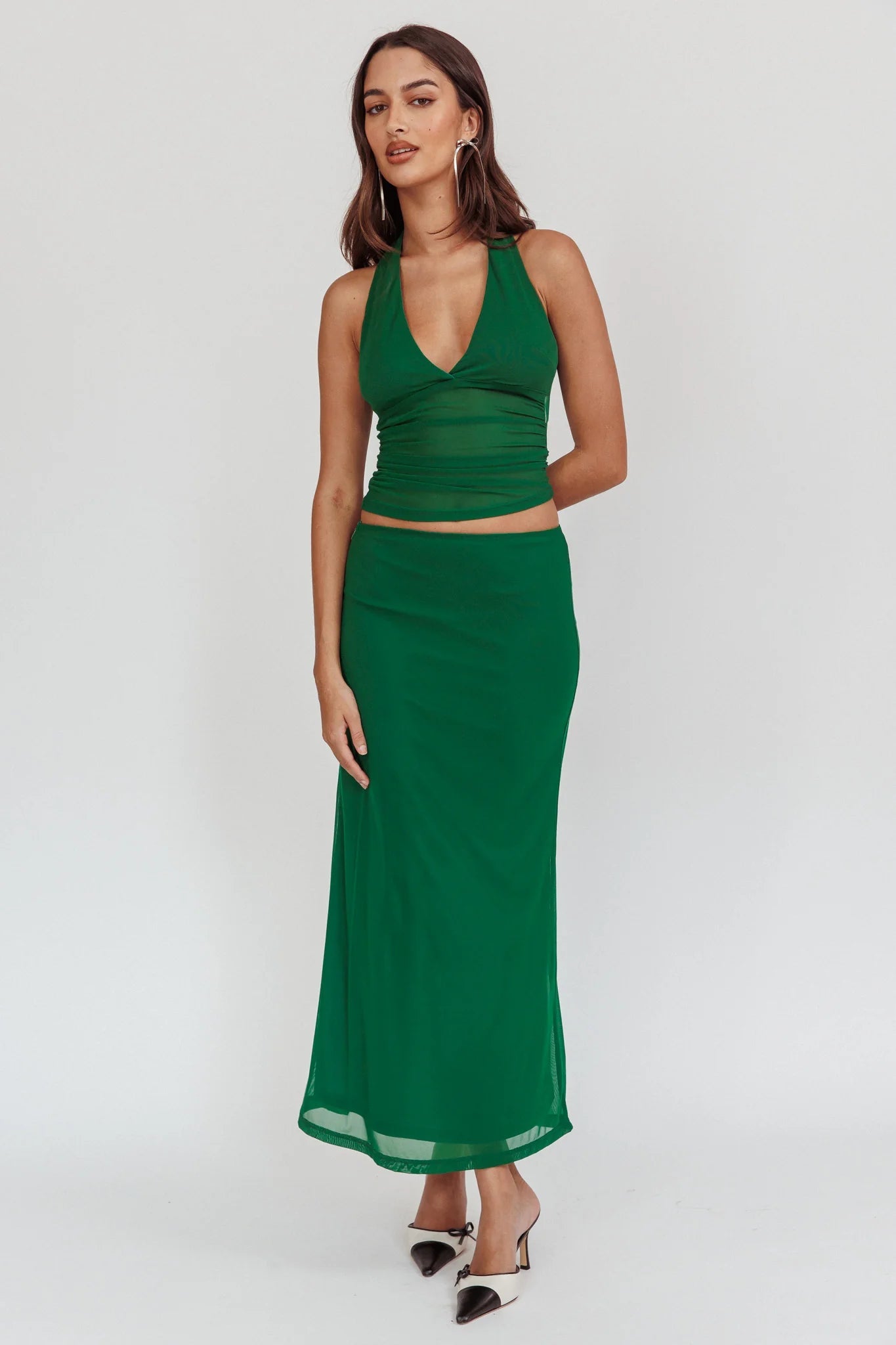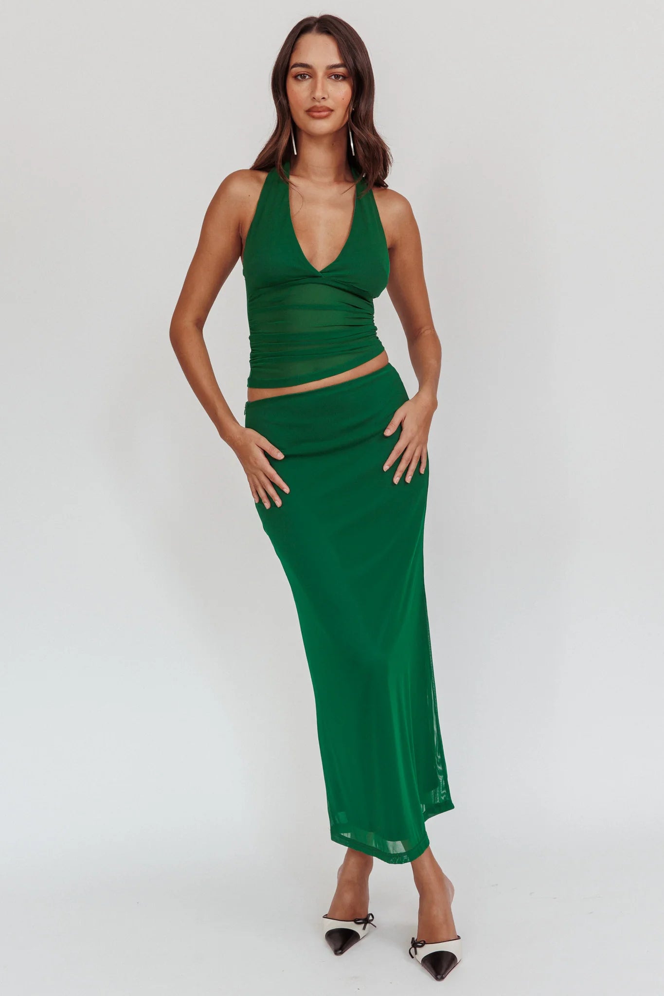 You'll leave them speechless in our hot Lorely skirt. Featuring a mesh overlay and maxi length, it's perfect for a girls' night out! Team it with its matching halter top and nude kitten heels and get ready to slay!