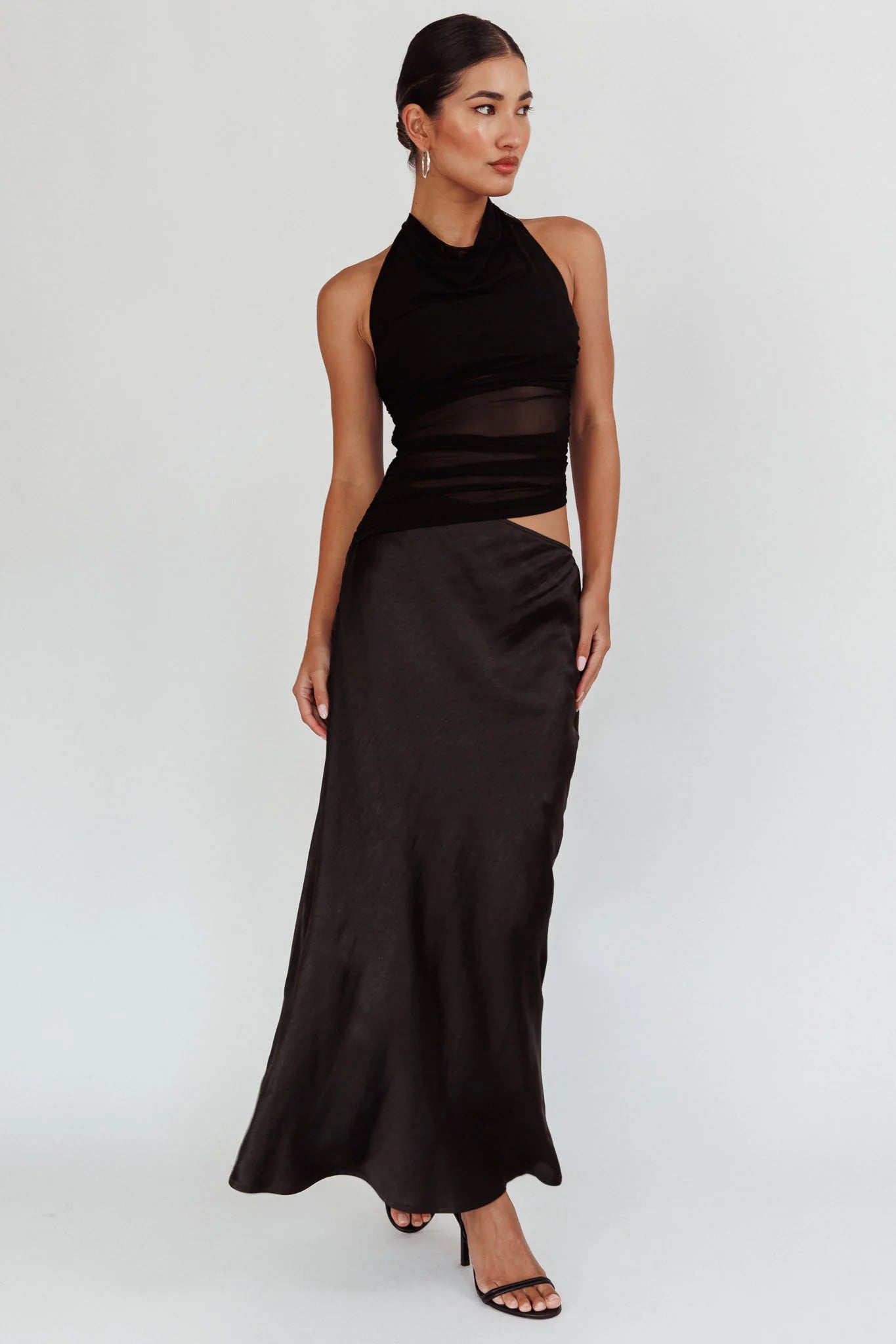 You'll leave them speechless in our hot Lorely maxi dress. It features a cut-out waist with ruched mesh in the bodice. It's perfect for a girls' night out. Team it with black heels and a purse and get ready to slay!