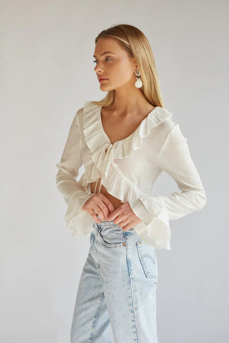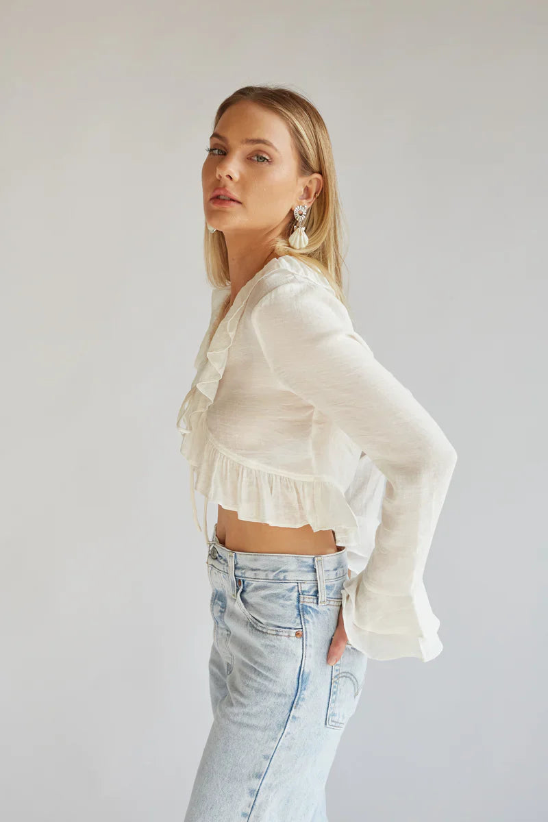 We've been daydreaming about the Lorraine Ruffled Long Sleeve Tie-Front Top! This beautiful top features long sleeves with flared cuffs, a darted bodice with a ruffle-trimmed V-neckline, a tie front detail, and a ruffled hem. Pair with some light wash to complete the look!