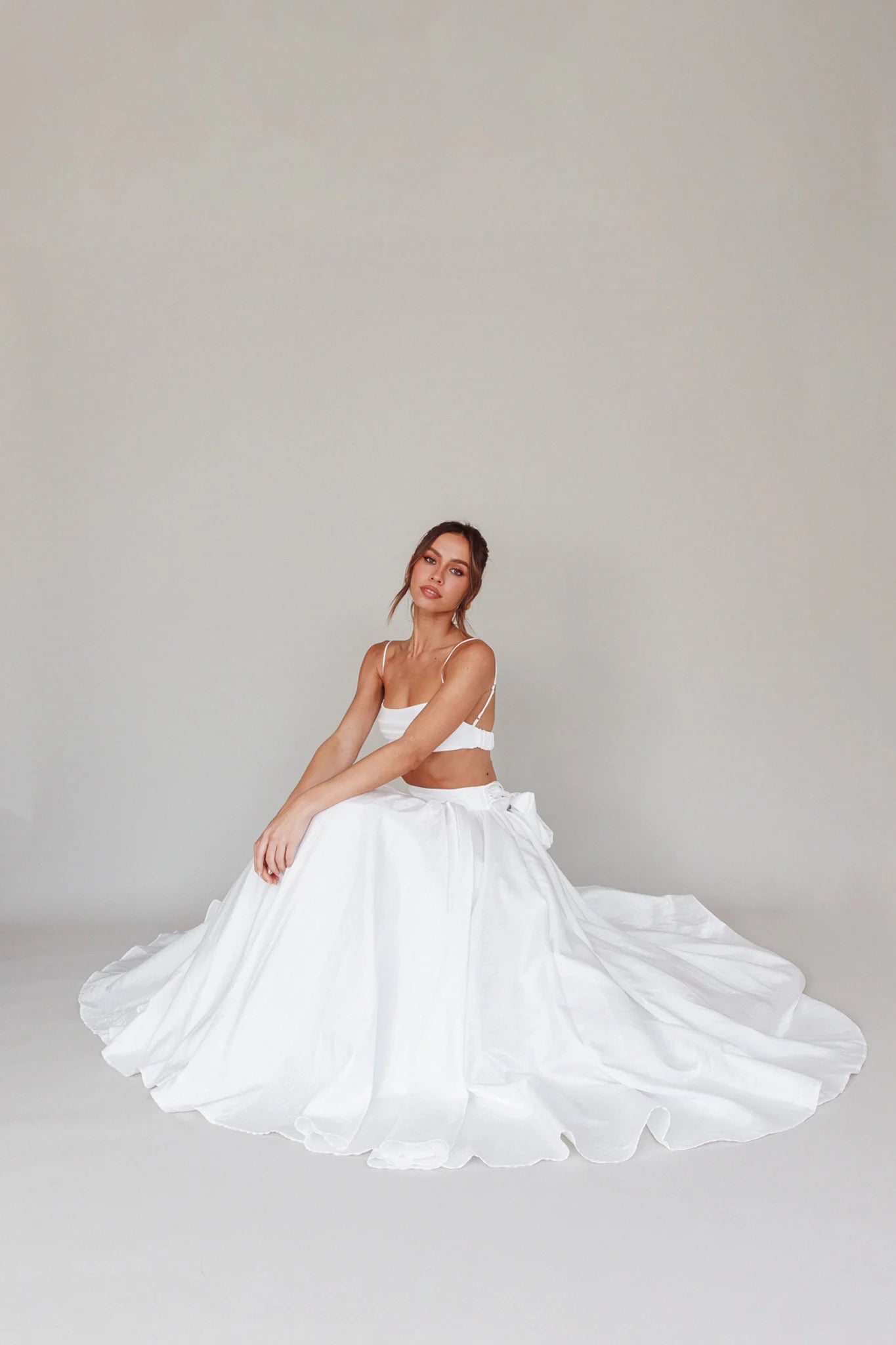 You'll feel like a princess in our stunning Love Songs maxi skirt. Featuring a gorgeous bow tie in the back, it's perfect for a modern bridal look. Team it with its matching crop top and diamante drop earrings for a look that won't be forgotten.