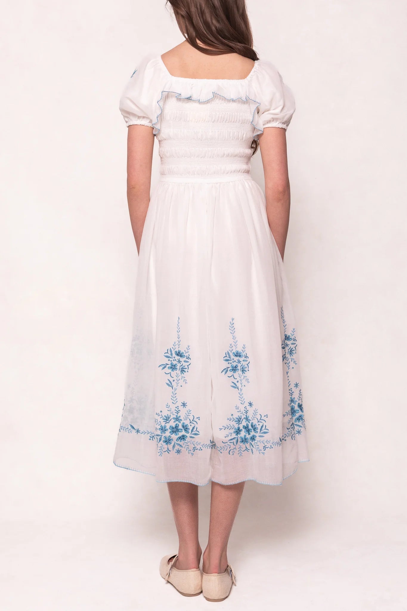 The Mae Dress is stitched with nostalgia in every thread—white cotton embroidered in blue, a square neckline framed by ruffles and an attached tie, and short puff sleeves. A smocked bodice offers ease and stretch, while the midi skirt features deep pockets for whatever the day may hold. Maternity and nursing friendly, because beauty should never come at the cost of comfort.