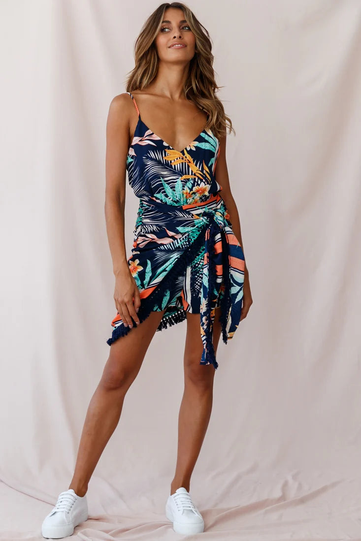 Say aloha to our Mahalo romper! Perfect for your next island vacay or rooftop pool party; it features a sunny, tropi-cool print, cami straps, V-neckline and tassel-trimmed wrap style skirt. Team it with bright, block color wedges for a playful look or go casual in a crisp white sneaker. Mahalo!