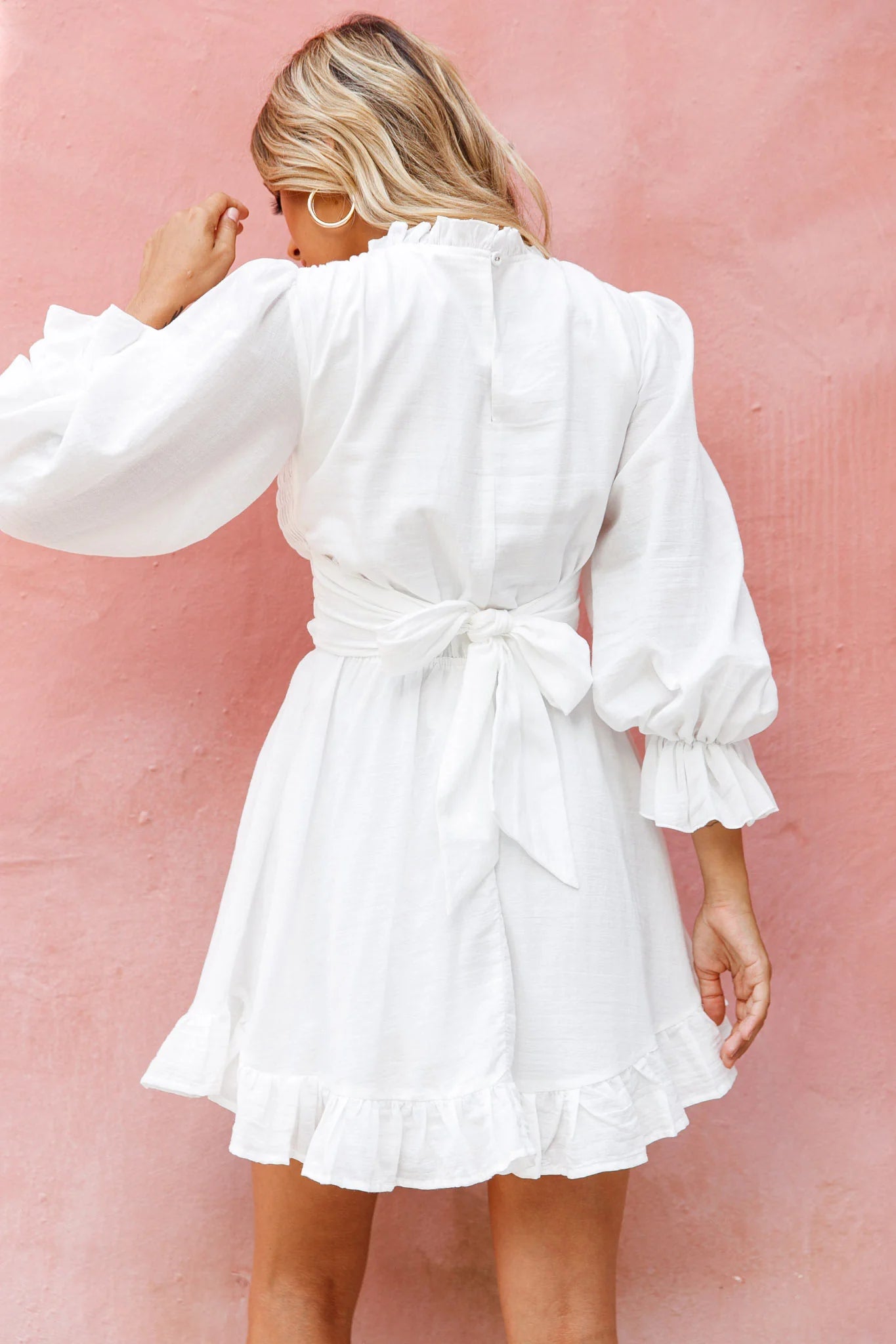 Two words you're going to hear when you wear this dress, super and cute! Our Marianna dress is just that with its adorable high neck and shirred bust. We are in love with its girly bow tie in the back. Perfect for the office or brunch with your besties, teamed with your fave mules and a beaded pearl tote. Super cute!