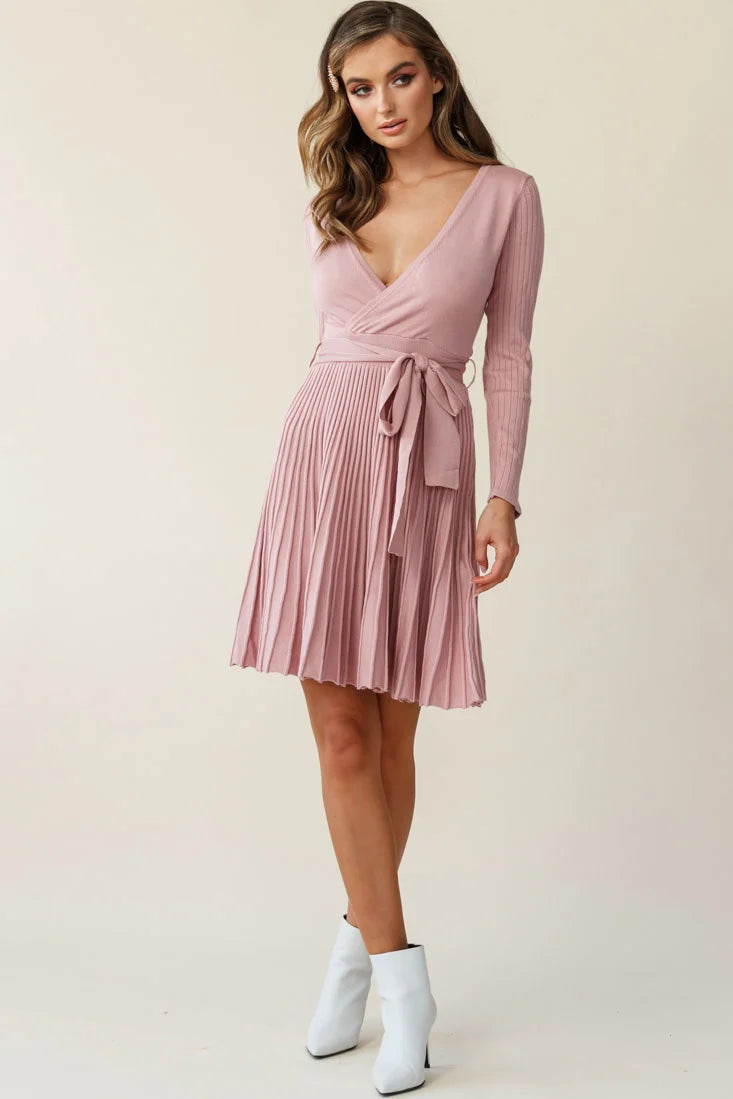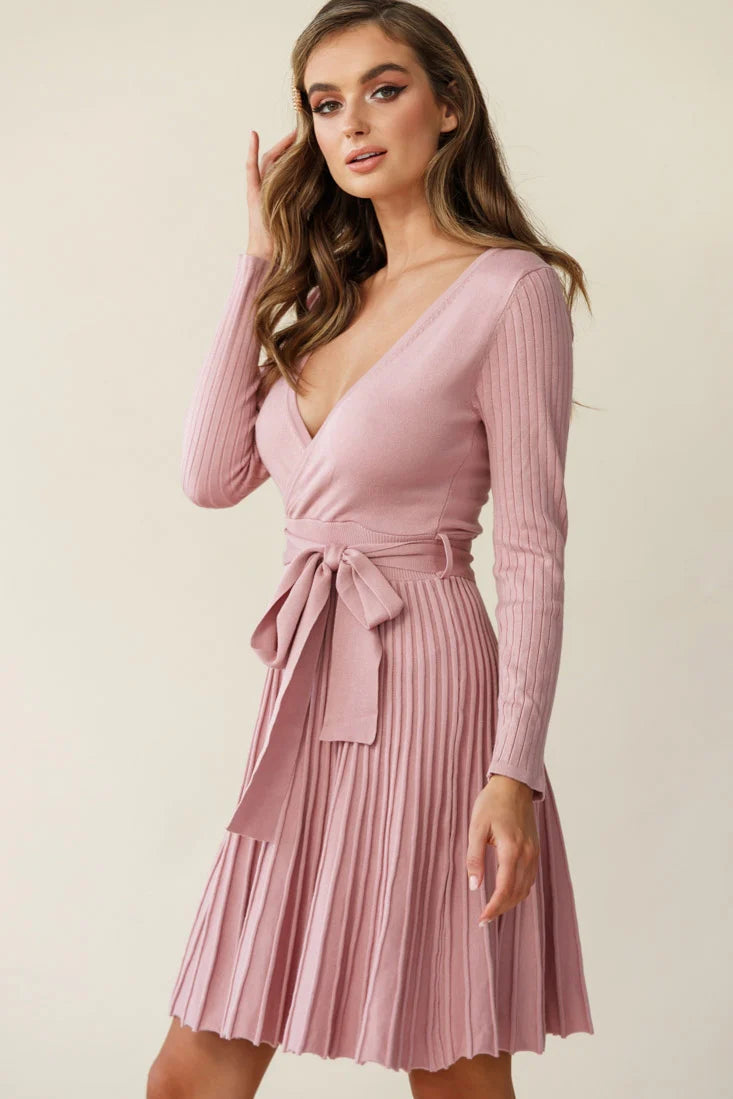 Turn heads in our pretty Marlena dress. It's cozy and chic with a light, knit fabric throughout, surplice neckline, long sleeves, separate waist tie and pleated detail skirt. Perfect for your 9-5 or lunch with the girls teamed with boots and a coat.