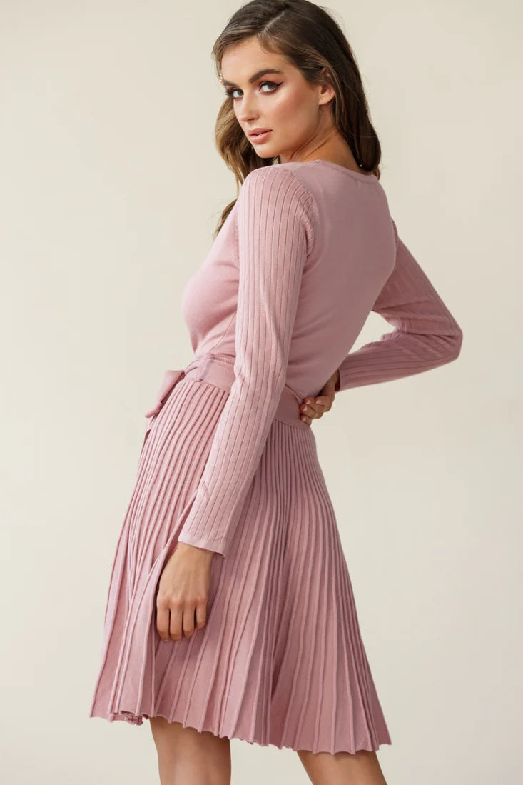 Turn heads in our pretty Marlena dress. It's cozy and chic with a light, knit fabric throughout, surplice neckline, long sleeves, separate waist tie and pleated detail skirt. Perfect for your 9-5 or lunch with the girls teamed with boots and a coat.