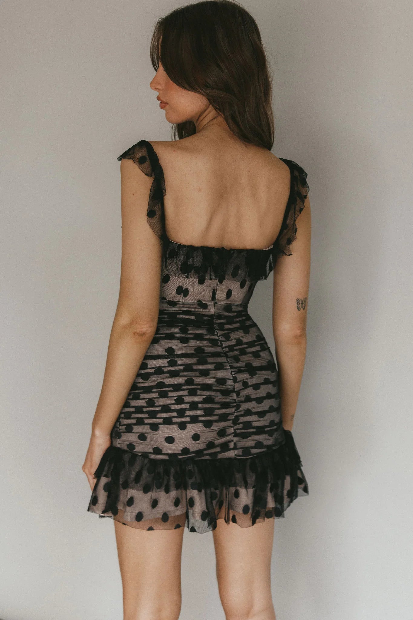 Chic and sweet, that's our Matilda. We are in love with the gorgeous, frill trim accents and pretty, polka dot mesh fabric. Perfect for a girls' night out or a birthday bash teamed with black, strappy stilettos and a chic clutch. Hot!