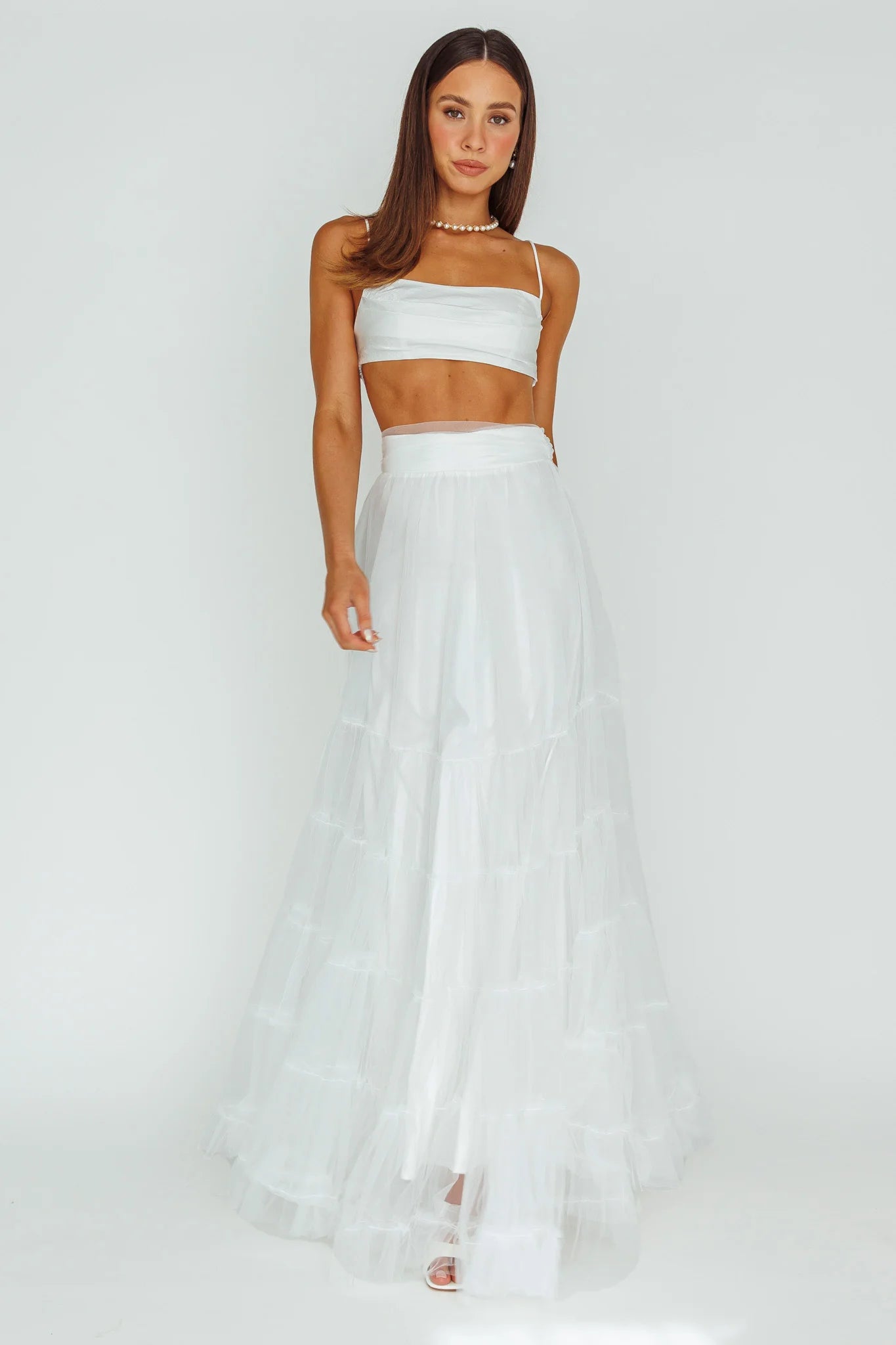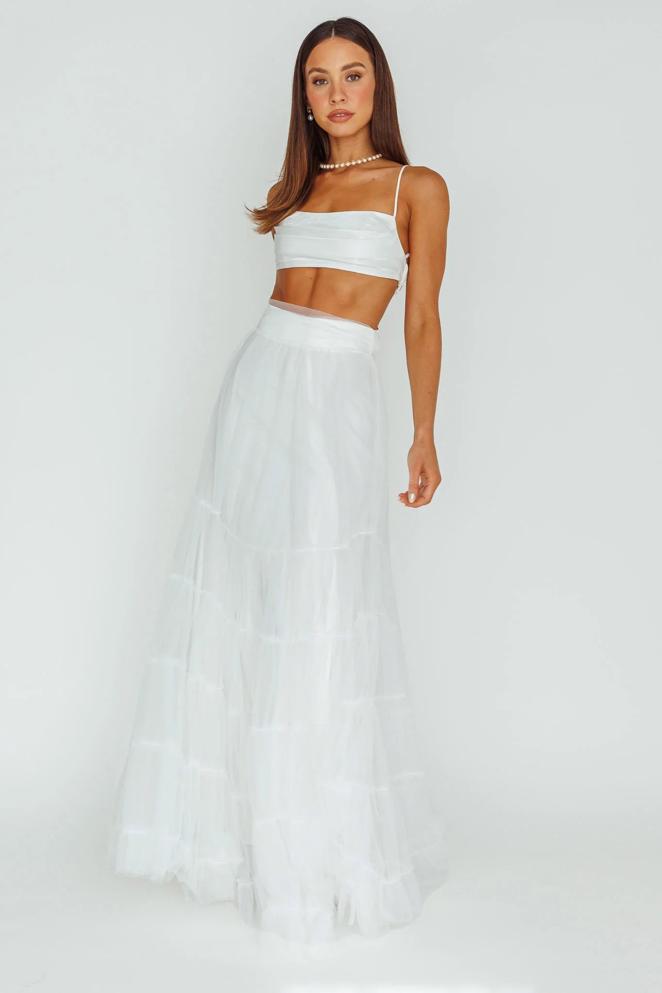 Make an entrance in our gorgeous Mavis maxi skirt. Featuring a mesh overlay and a frill hem, it's perfect for dancing the night away after your walk down the aisle! Team it with our Love Songs crop top and satin pumps for a modern day Cinderella look!