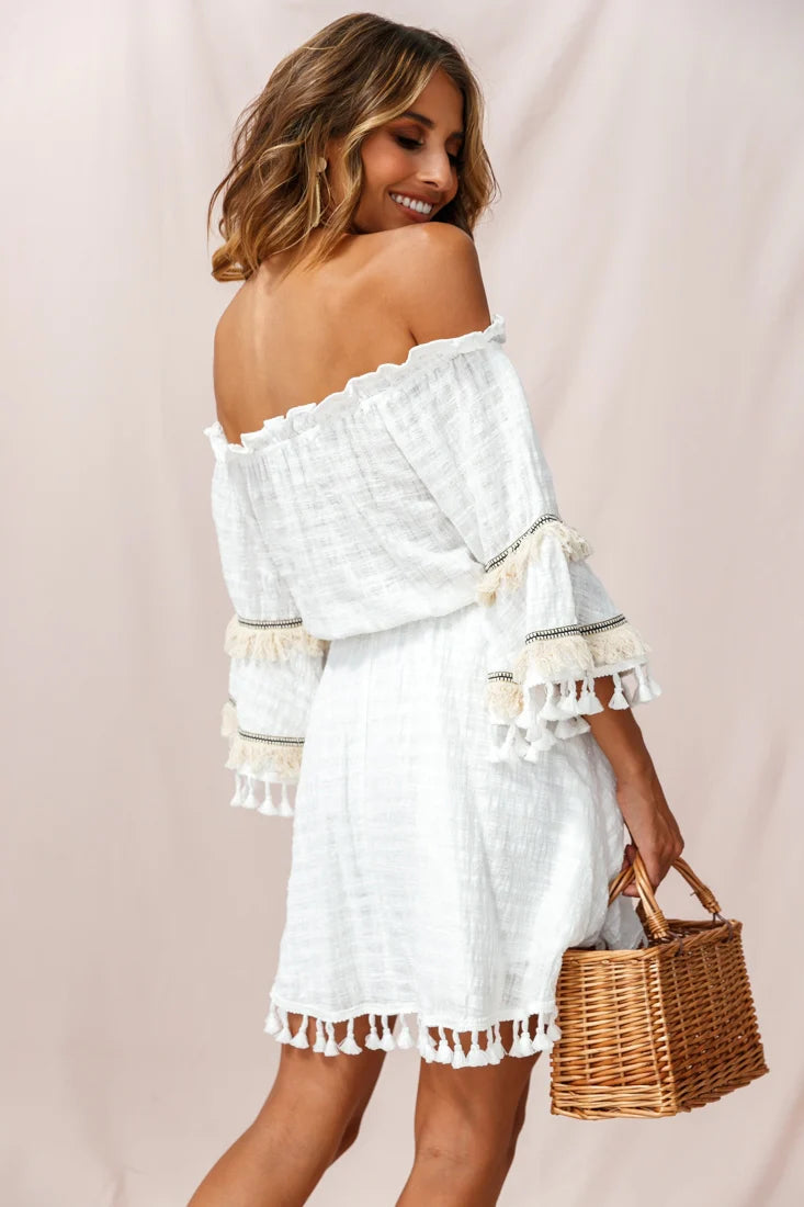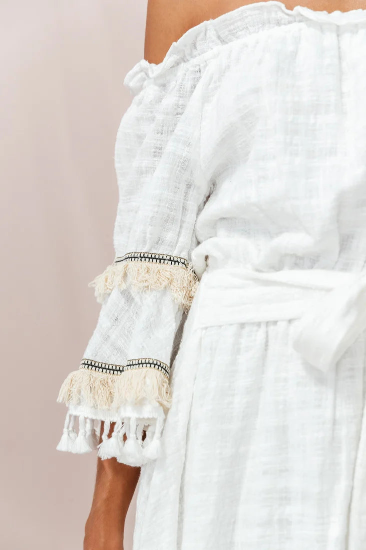 You'll feel like escaping to a tropical island paradise in our pretty linen Maya dress. Partially lined it features an off-shoulder neckline with fluted sleeves, elasticated waist and tassel and bead trim details. Perfect for warm nights sipping piña coladas at your favorite beach bar or Sunday brunch with your besties. Team it with espadrille wedges and a straw tote for a look we are loving!