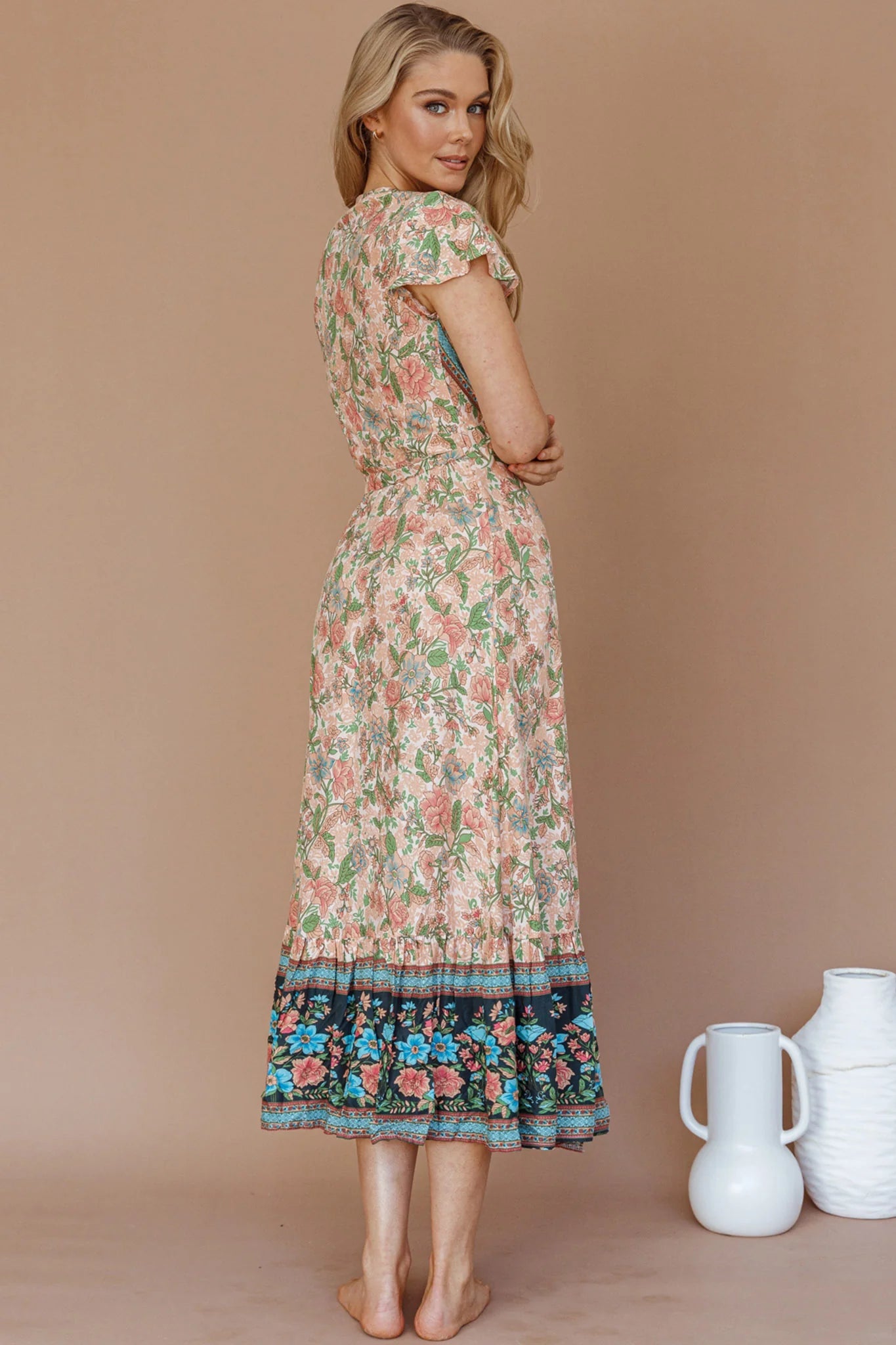 Make a statement in our pretty Mayan midi dress. Featuring fluttery angel sleeves, a wrap-style waist that ties at the side and a fluted hem. We are loving its boho-femme floral print! Perfect for a day strolling the vintage markets teamed with a straw hat and canvas wedges.
