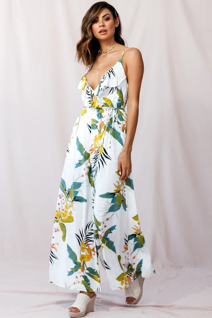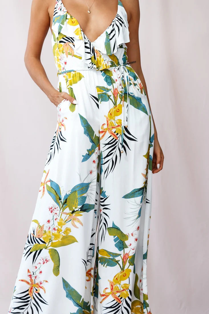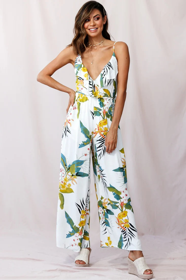 Elegant and feminine, this jumpsuit is perfect for a first date with that guy you've spent all week insta-stalking. Lined in the shorts, it also features a flattering ruffle-trimmed V-neckline, cami straps, pockets, shirred back and a string tie around the waist. Pair it with tan mules and a woven straw bag and get ready for a second date.