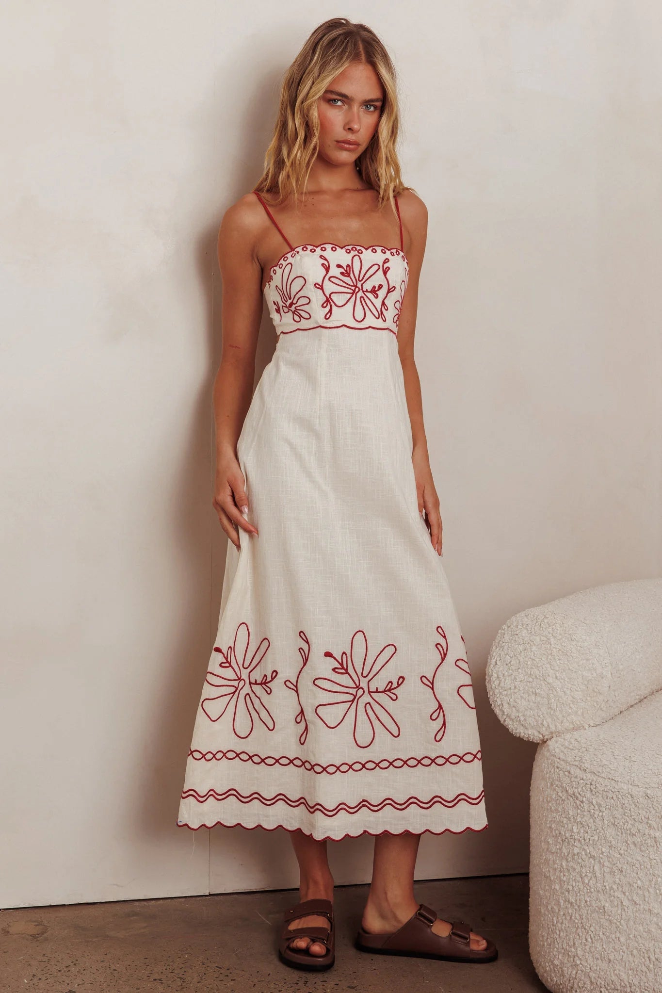 Hello, sunshine! We've fallen head over heels for our adorable Mondo maxi dress. It features the sweetest embroidery detail and a tie closure in the back. Wear it on weekends for coffee with your girls, teamed with a tote and sandals for a chic look.