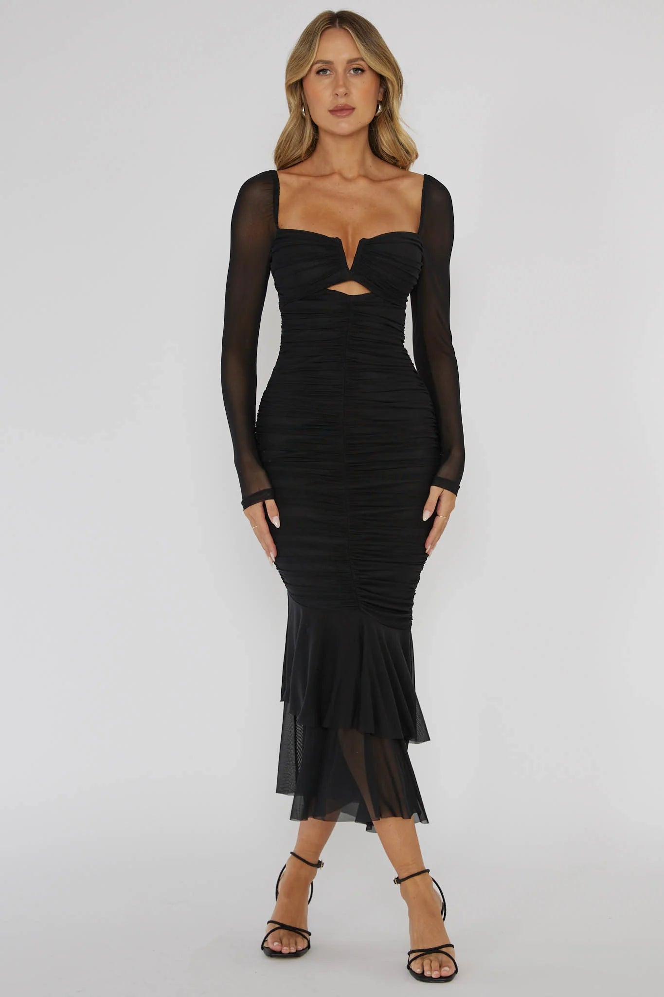 Make an entrance in our stunning Nadia midi dress. Featuring a fishtail style and ruching throughout, we're in love! Perfect for a wedding or birthday dinner! Team it with a clutch and black heels for a look that will turn heads.