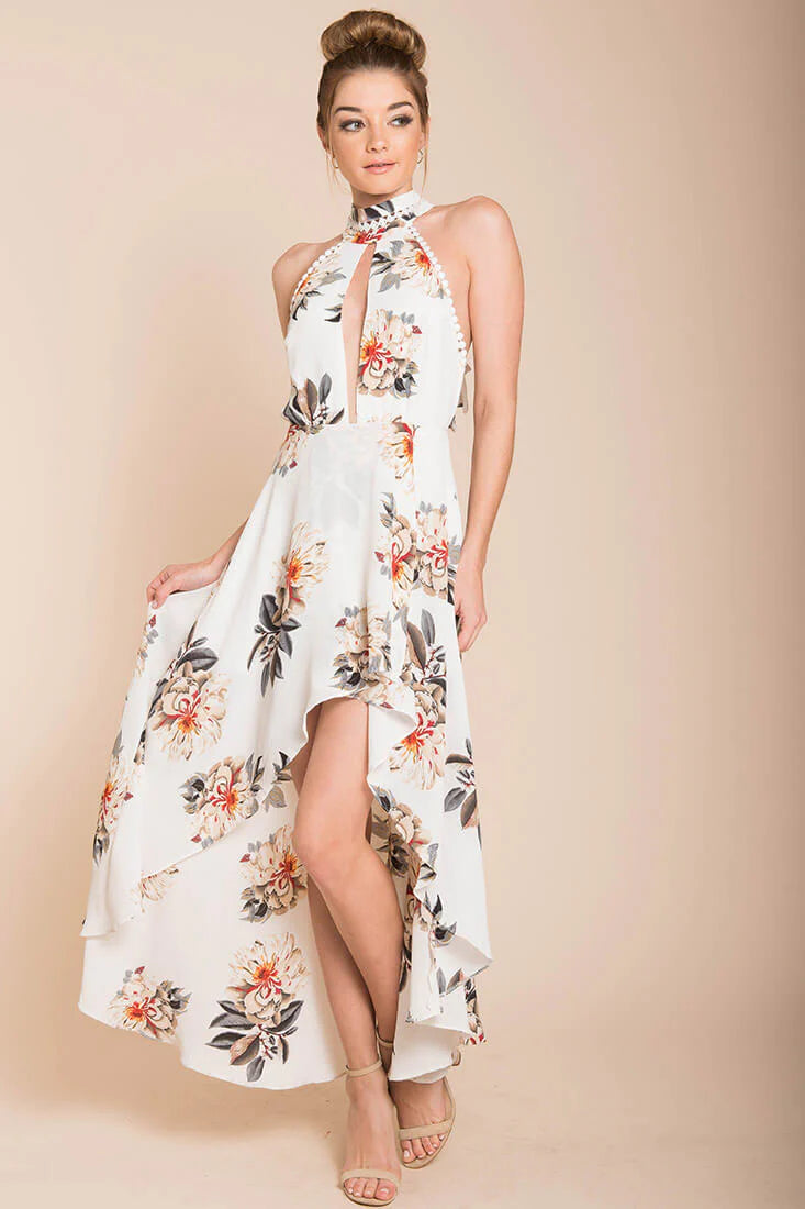Peek a boo middle slit exposes a little skin, while the pretty neck tie are exceptionally pretty. This gorgeous high-low frock looks incredible with white sandals.