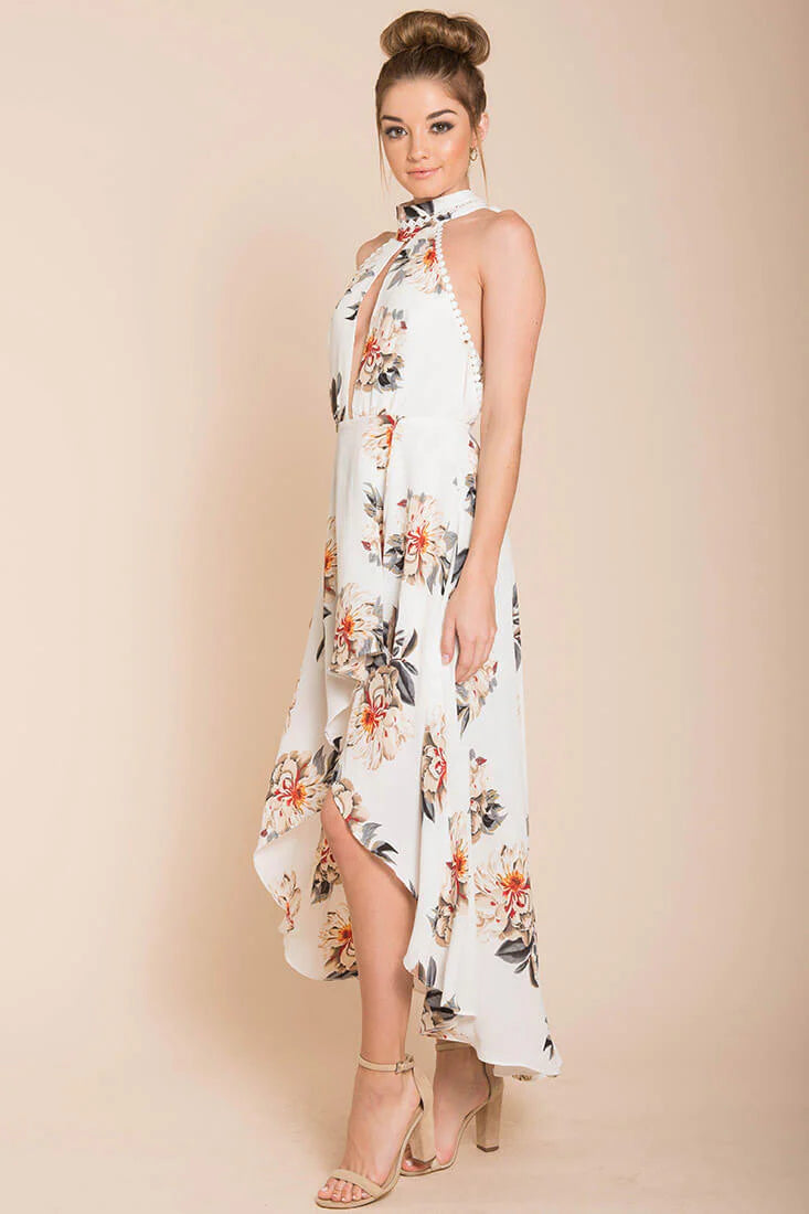 Peek a boo middle slit exposes a little skin, while the pretty neck tie are exceptionally pretty. This gorgeous high-low frock looks incredible with white sandals.