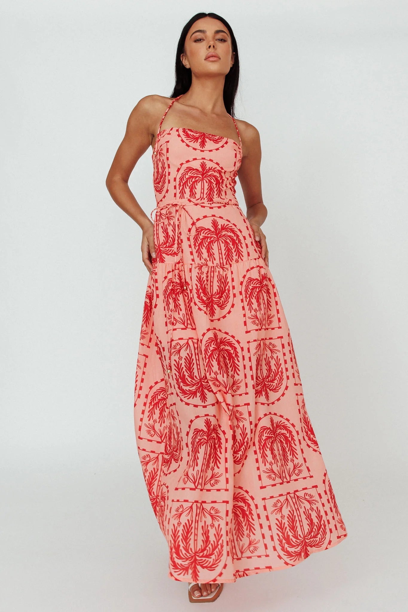 Breeze through the weekend in our chic Natasia maxi dress. We are obsessed with its Summery palm print and classic halterneck style. Perfect for champagne brunch with your girls teamed with kitten heels and a saddle bag for a sophisticated look that will turn heads.