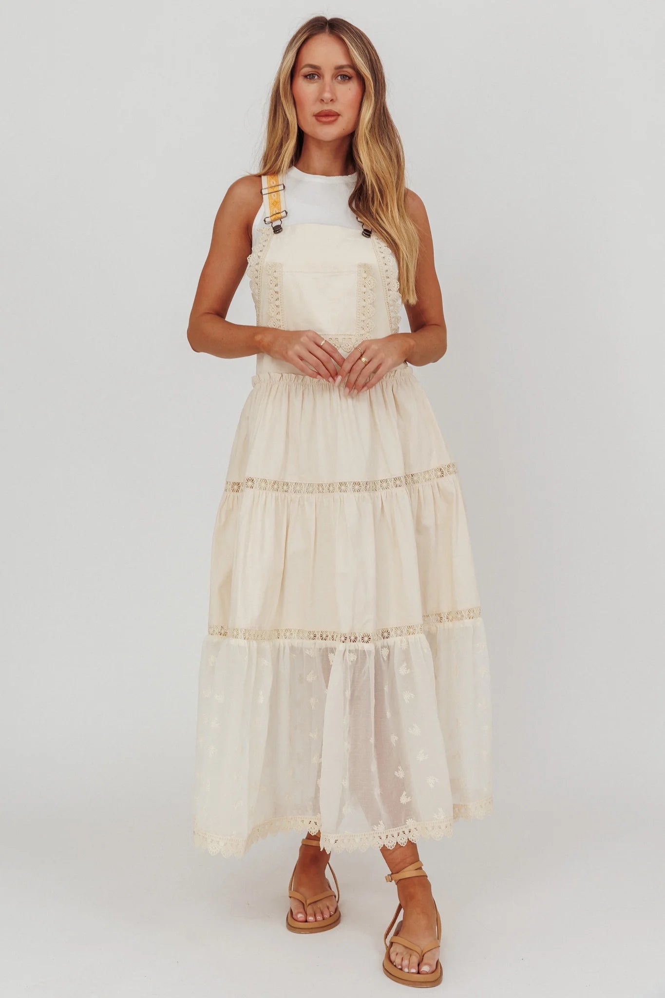 You'll feel like packing a picnic with your girls for a Sunday fun day in our adorable Odeyah maxi dress. It features overall straps and a super cute lace trim. Wear it over a baby tee and teamed with your fave sandals and a tote for a boho-babe look we are loving.
