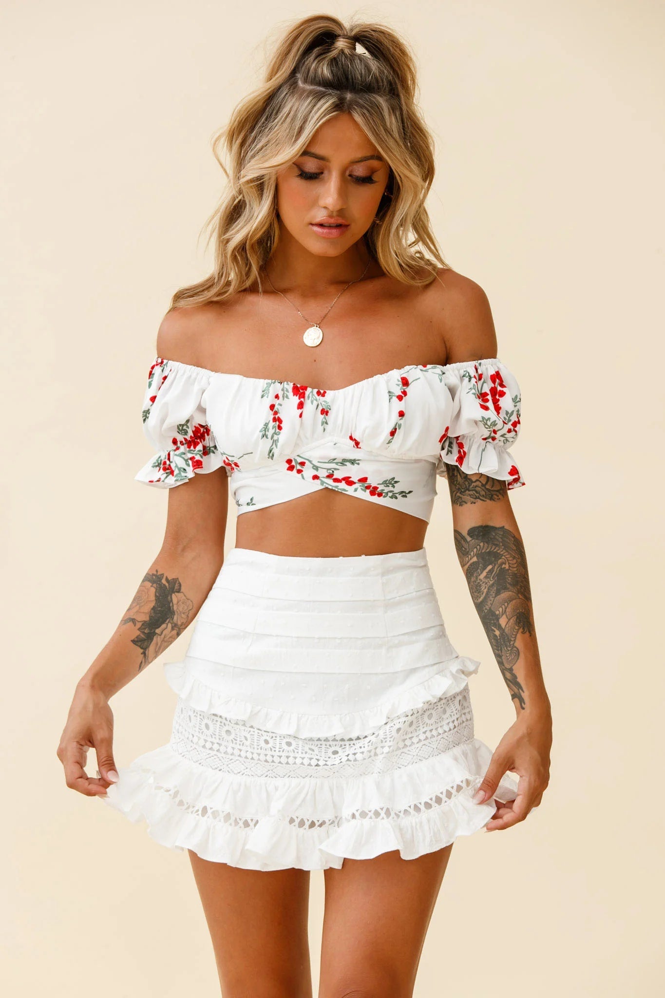 Own the day in our prettiest Perfect Timing skirt. We are loving its feminine silhouette and girly frill and crochet trim details. Perfect for Sunday brunching with your besties teamed with our Linka top and mules for a chic look.