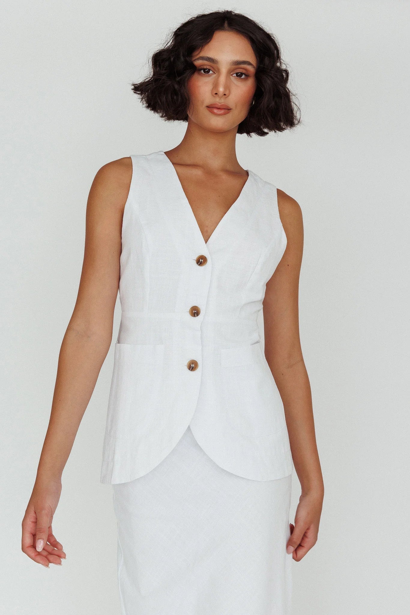 You'll go straight to the best-dressed list in our on-trend Philomena vest. Featuring front pockets and a button closure. It's perfect for your 9-5 or dinner with your girls. Team it with its matching midi skirt and kitten heels for a look that will turn heads.