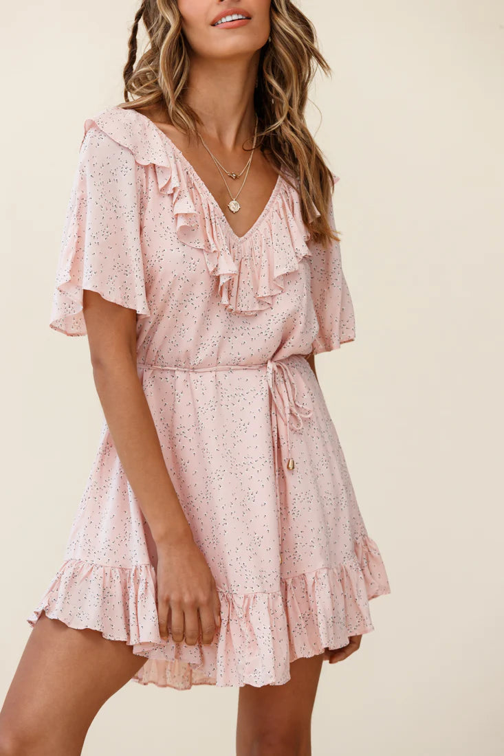 We are in love with our casual-chic Piper dress. Complete with fluttery angel sleeves and a V-shape back with ties and golden toggles. It's the perfect choice for running errands (in effortless style) or catching up with your girls for lunch. Team it with nude, strappy block heels and a tote for a look we are loving.