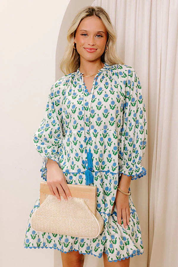 - Flowy and fabulous, this floral mini dress is your go-to for effortless style! Its relaxed fit keeps things easy-breezy, while the delicate ruffle detailing adds a playful touch. Perfect for brunch dates, casual outings, or any moment that calls for a sweet, stylish vibe. - Lightweight material with a blue and green colored floral print - A built-in skirt lining - A v-cut neckline with ruffle detailing and a tie featuring sky blue colored accent tassels - Green ricrac trim - Long sleeves with elastic ruffle cuffs - Hidden side pockets - A flowy, relaxed silhouette that ends in a ricrac trimmed, mini dress length hemline