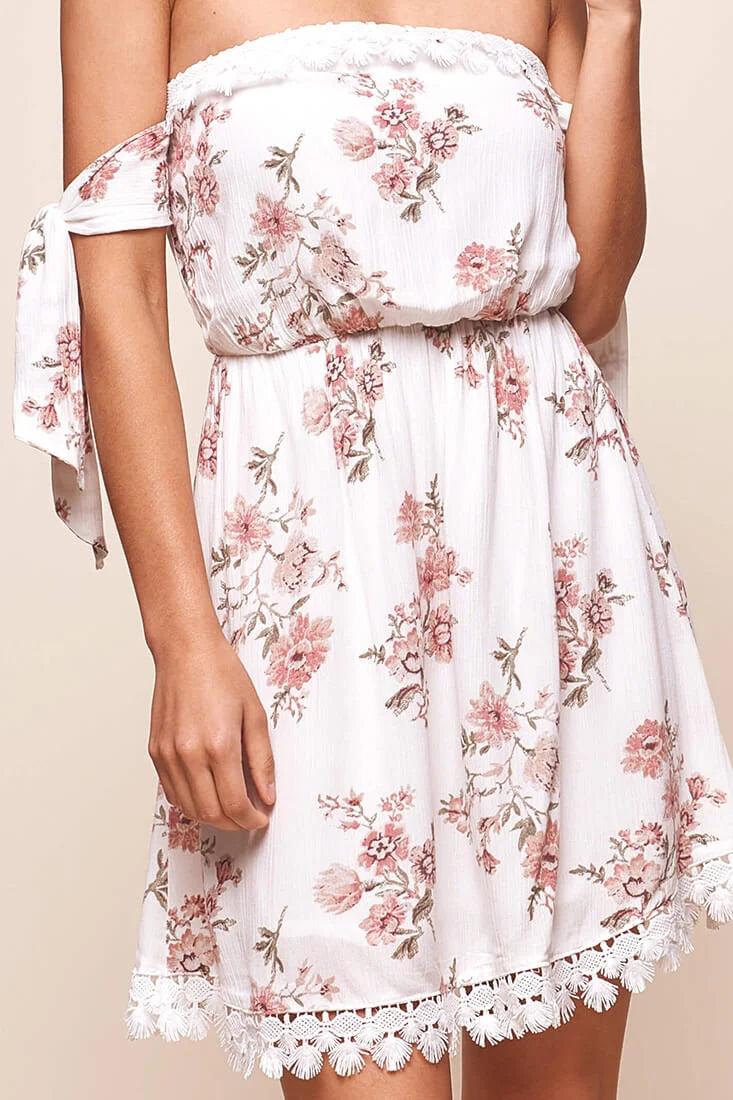 Look like butter wouldn't melt in your mouth with this adorable bardot dress. Featuring an elasticated waist, embroidery trim and romantic ties around the arms, this adorable dress is perfect for a first date strolling the pier at sunset and riding the ferris wheel. Pair with your favorite wedges and don't forget the cotton candy!