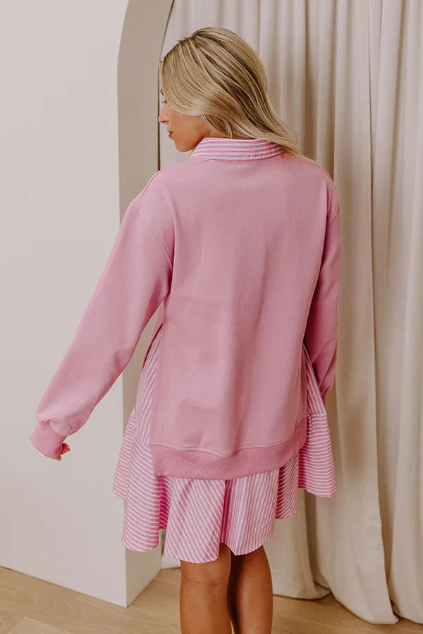 - This adorable mini dress is a total wardrobe must-have! With its playful faux layered design, it's your go-to for creating effortlessly trendy and preppy vibes. - Unlined - Features warm sweatshirt material as well as lightweight white and pink hued striped material - A faux two piece design - A collared v-cut neckline - Long sleeves with ribbed cuffs - Hidden side pockets - A relaxed silhouette that ends in a subtly ruffled, mini dress length hemline