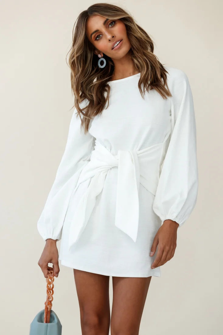 You've never looked better, all wrapped up in our Rapt dress. Featuring long balloon sleeves, soft knit fabric, mini length skirt and flattering adjustable, wide waist-tie at the front to give you the perfect curvy silhouette from behind. Team it with boots and gold hoop earrings.