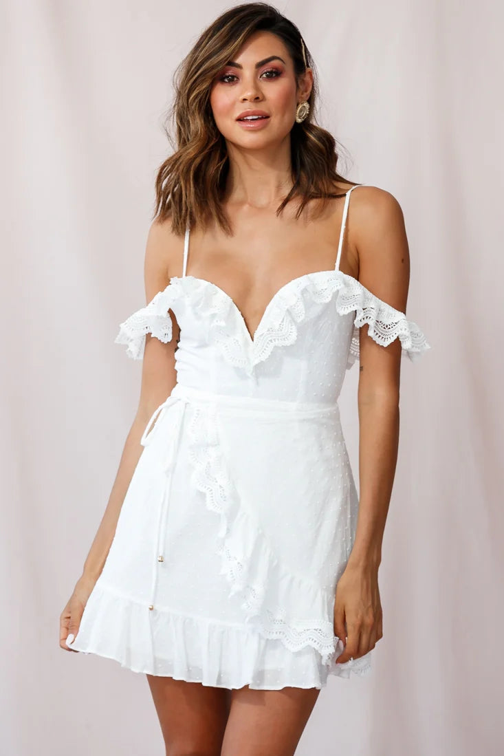 Cast a spell on anyone who looks your way in our sweet Reverie dress. Perfect for a night out on the town with your best gals, this dress features a cute, cami strap cold-shoulder design with lace ruffle trim, plunging sweetheart neckline, wrap-look skirt and tie-up back. Team it with mules and a clutch for a look we are loving.