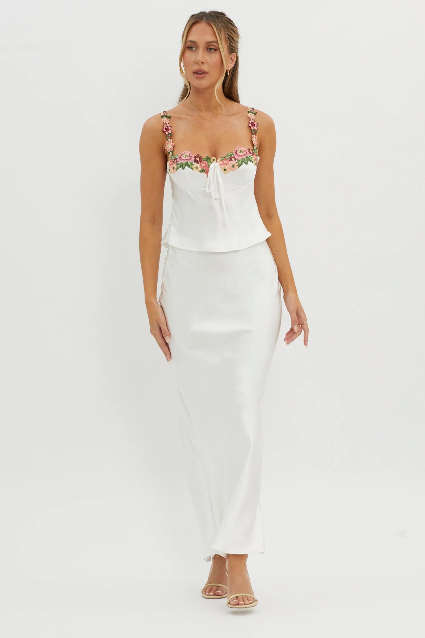 Heads will turn when you walk by in our gorgeous Rose Garden cami top. We are in love with its pretty, floral applique trim! Perfect for a flirty first date teamed with its matching skirt and strappy, nude heels for a romantic look we are loving.