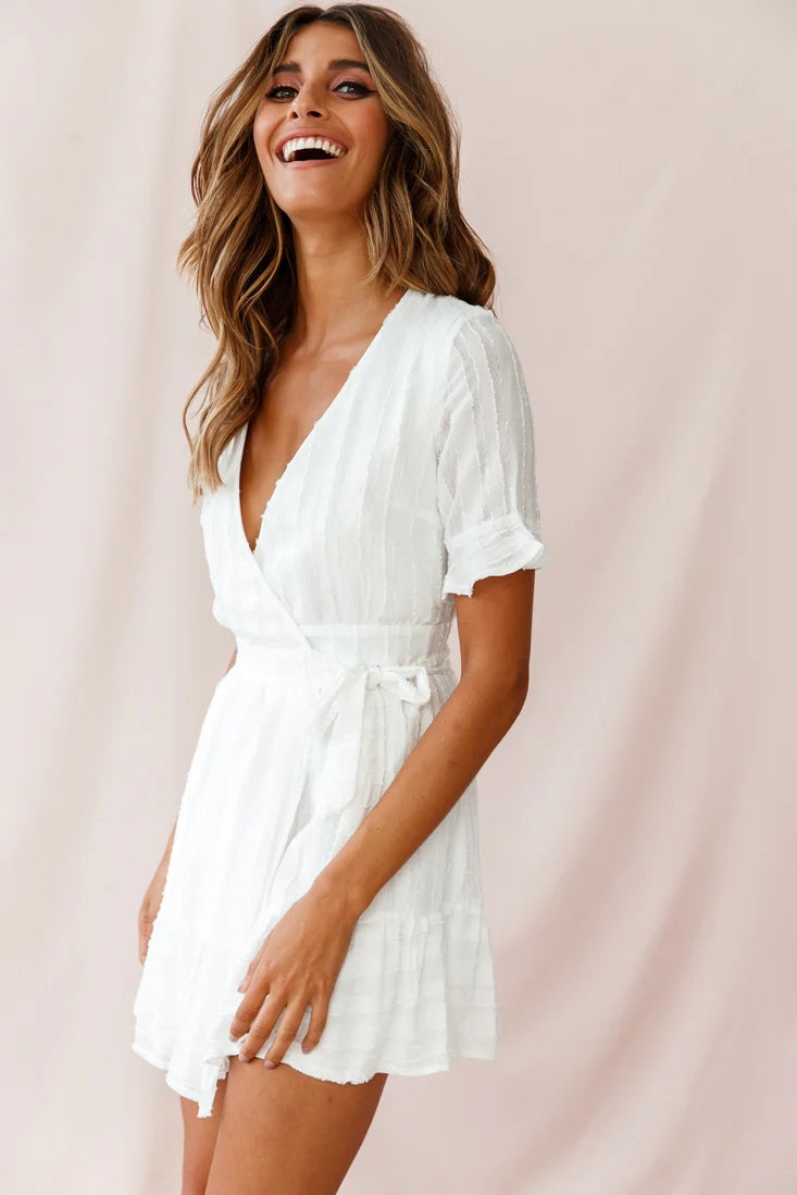 Ooze feminine chic in our super cute Rubi dress. Partially lined, it features a V-neckline, frill-trimmed half sleeves and a flattering wrap style. Perfect for work or play, teamed with some strappy nude heels and gold hoops. Watch jaws drop as you strut by.
