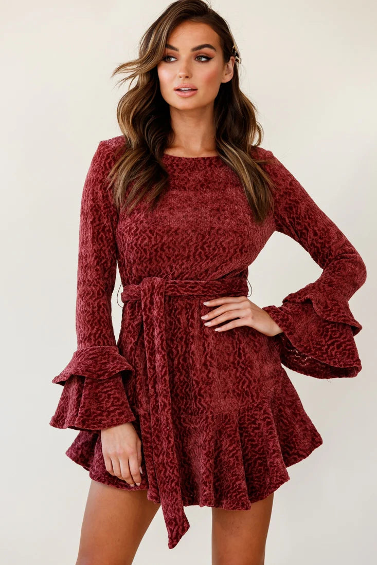 Stay warm and look chic while doing it, in our Saphira dress. Featuring soft knit fabric, layered flare cuffs, separate waist tie and fluted hem. Perfect for a lunch date with your besties teamed with suede thigh-high boots for a look we are loving.