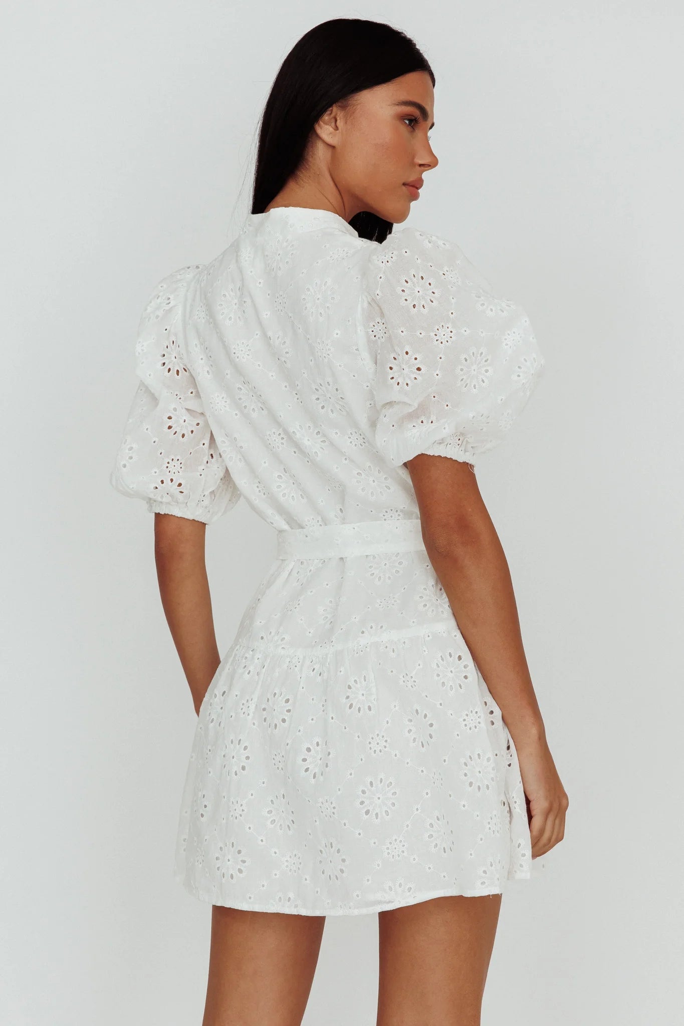 Float through your weekend in our Serita mini dress. We are in love with its girly eyelet embroidery fabric and sweet puff sleeves. It's perfect for running errands in style or a lunch date with your bestie. Team it with mules or sandals for an effortless-chic look.
