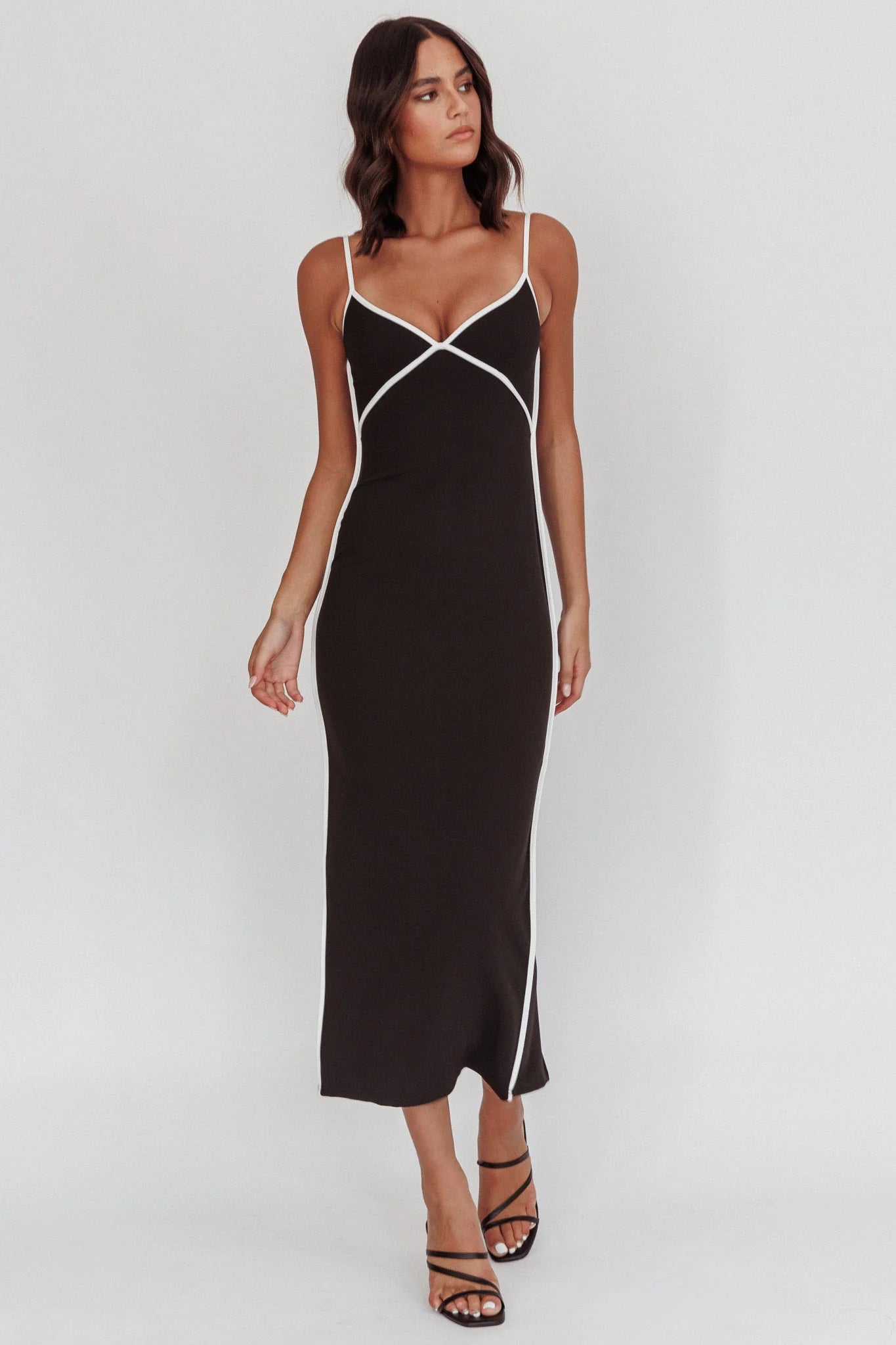 Turn heads in our super hot She's A Mystery maxi dress. It features a contrasting piping trim and deep V-neckline and is just what you need for your next girls' night out! Team it with stiletto heels and a mini purse for a look that will make jaws drop.